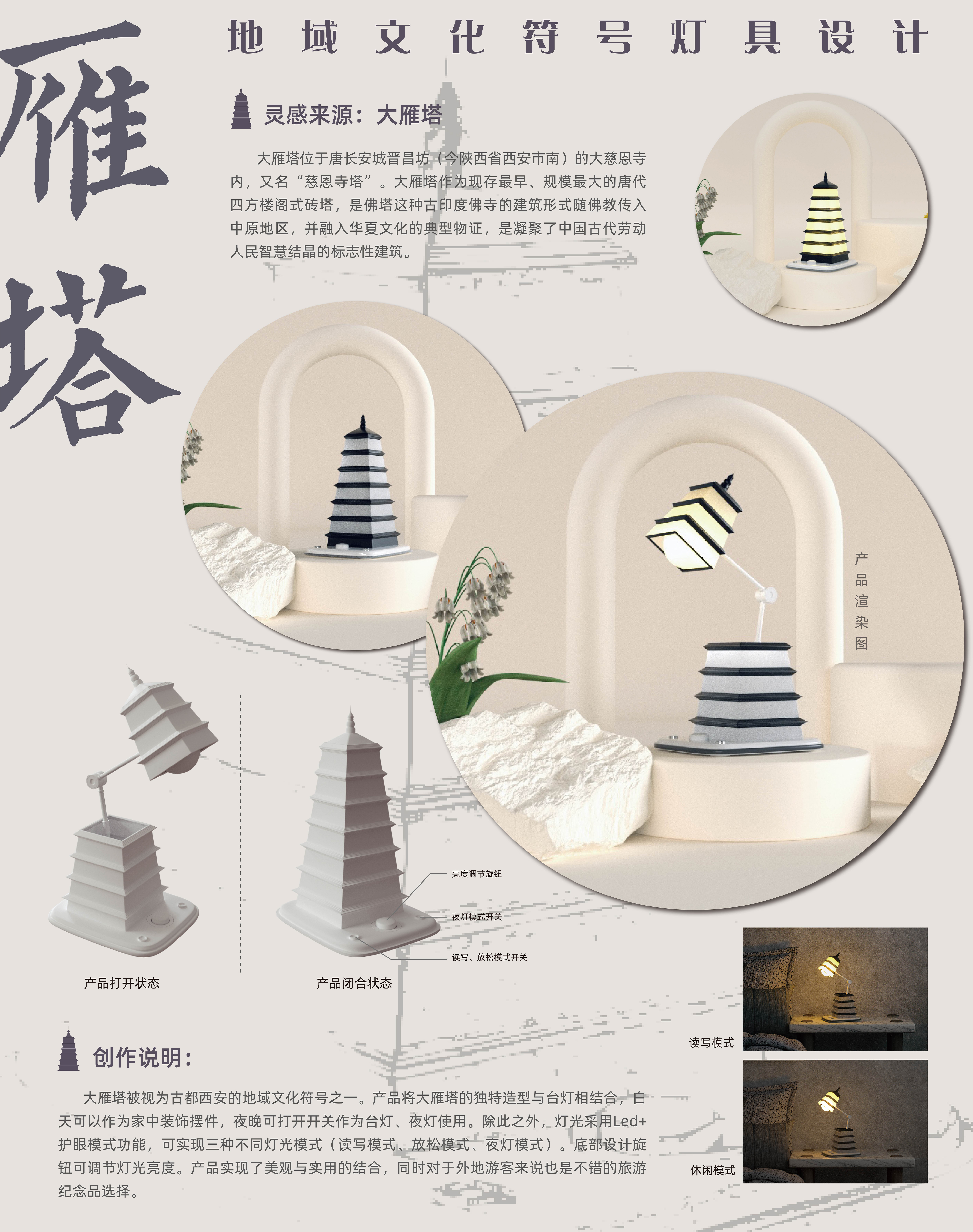 大雁塔被视为古都西安的地域文化符号之一。产品将大雁塔的独特造型与台灯相结合,白天可以作为家中装饰摆件,夜晚可打开开关作为台灯、夜灯使用。除此之外,灯光采用Led+护眼模式功能,可实现三种不同灯光模式(读写模式、放松模式、夜灯模式)。底部设计旋钮可调节灯光亮度。产品实现了美观与实用的结合,同时对于外地游客来说也是不错的旅游纪念品选择。