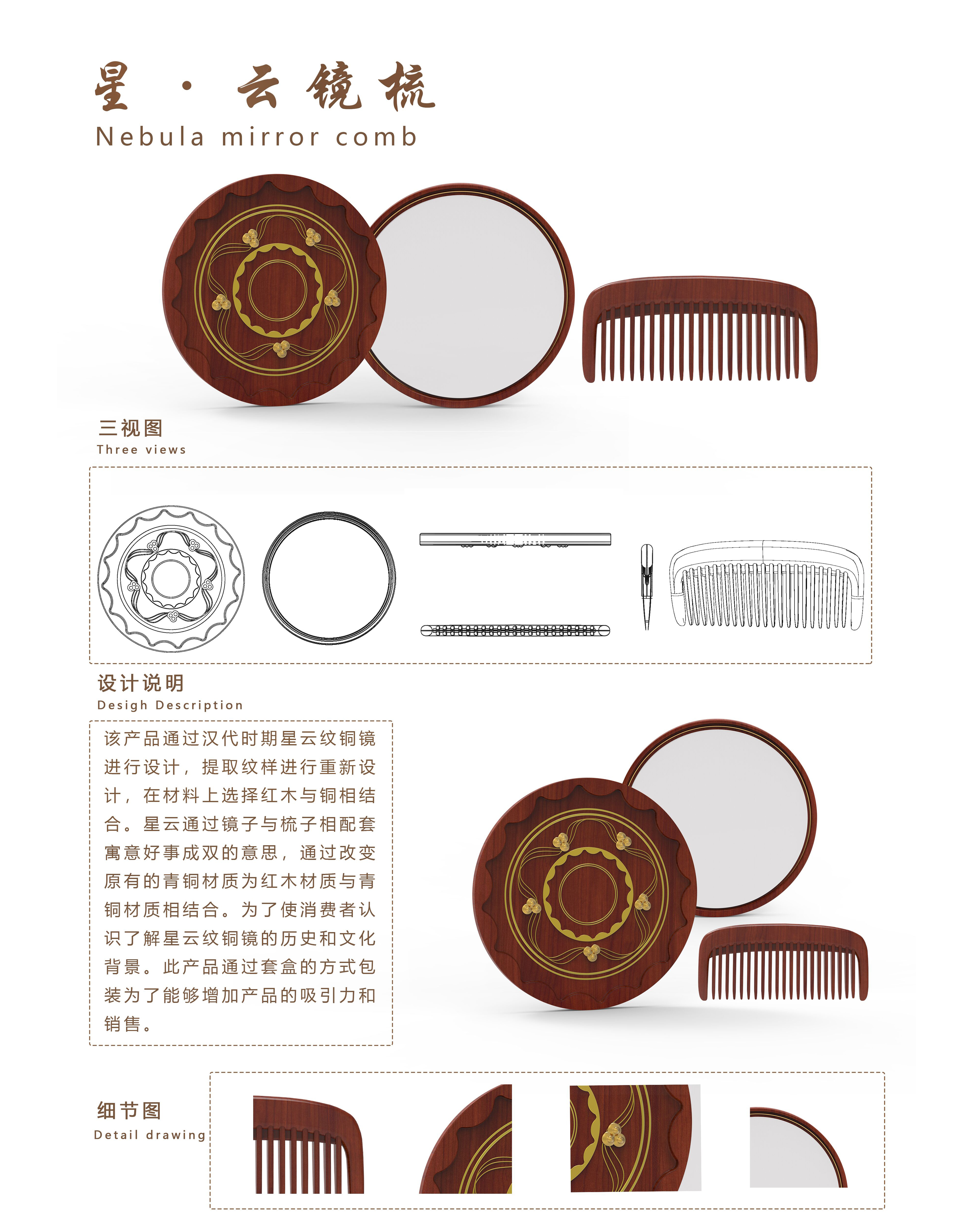 该产品通过汉代时期星云纹铜镜进行设计,提取纹样进行重新设计,在材料上选择红木与铜相结合。星云通过镜子与梳子相配套寓意好事成双的意思,通过改变原有的青铜材质为红木材质与青铜材质相结合。为了使消费者认识了解星云纹铜镜的历史和文化背景。此产品通过套盒的方式包装为了能够增加产品的吸引力和销售。