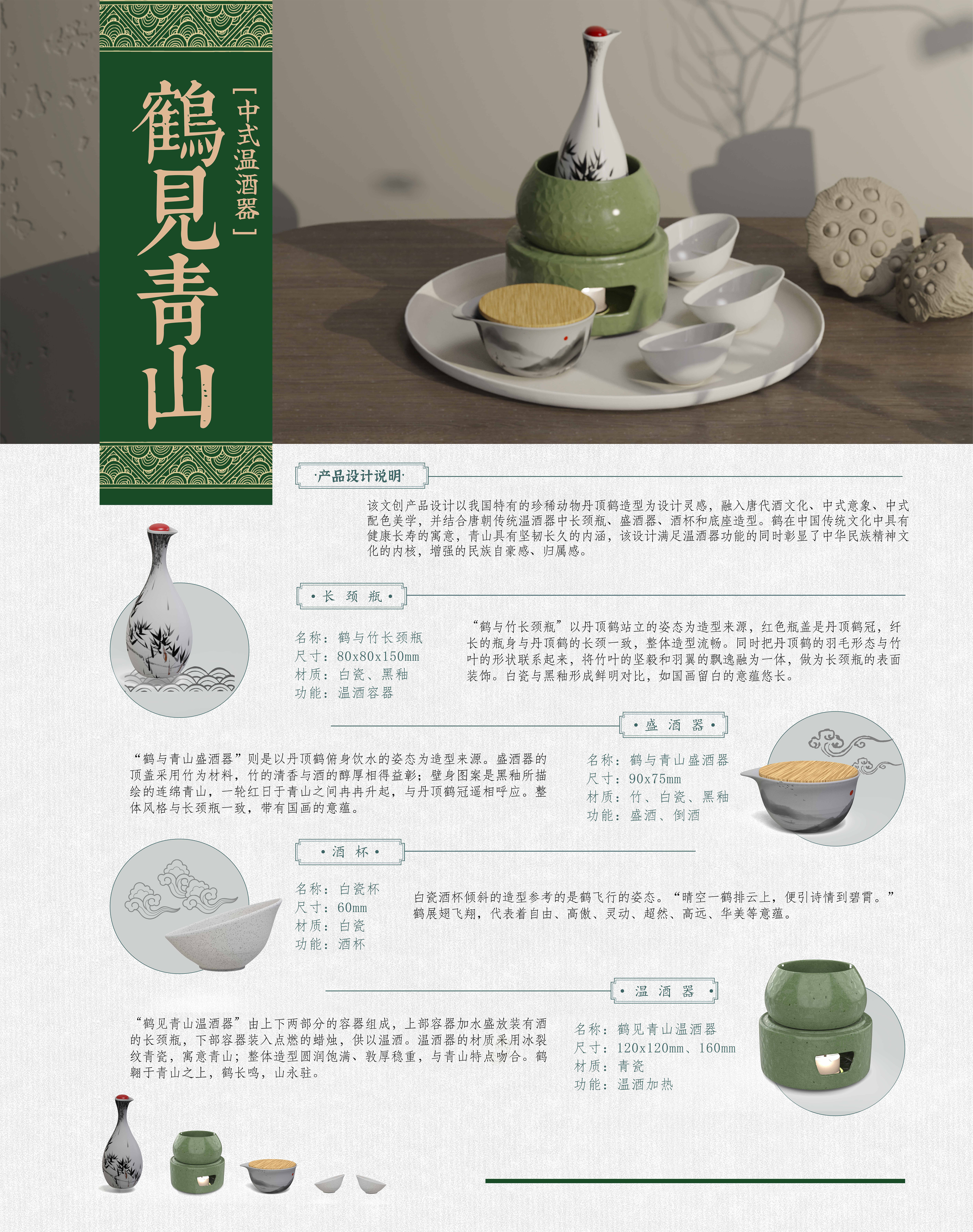 该文创产品设计以我国特有的珍稀动物丹顶鹤造型为设计灵感,融入唐代酒文化、中式意象、中式配色美学,并结合唐朝传统温酒器中长颈瓶、盛酒器、酒杯和底座造型。鹤在中国传统文化中具有健康长寿的寓意,青山具有坚韧长久的内涵,该设计满足温酒器功能的同时彰显了中华民族精神文化的内核,增强的民族自豪感、归属感。