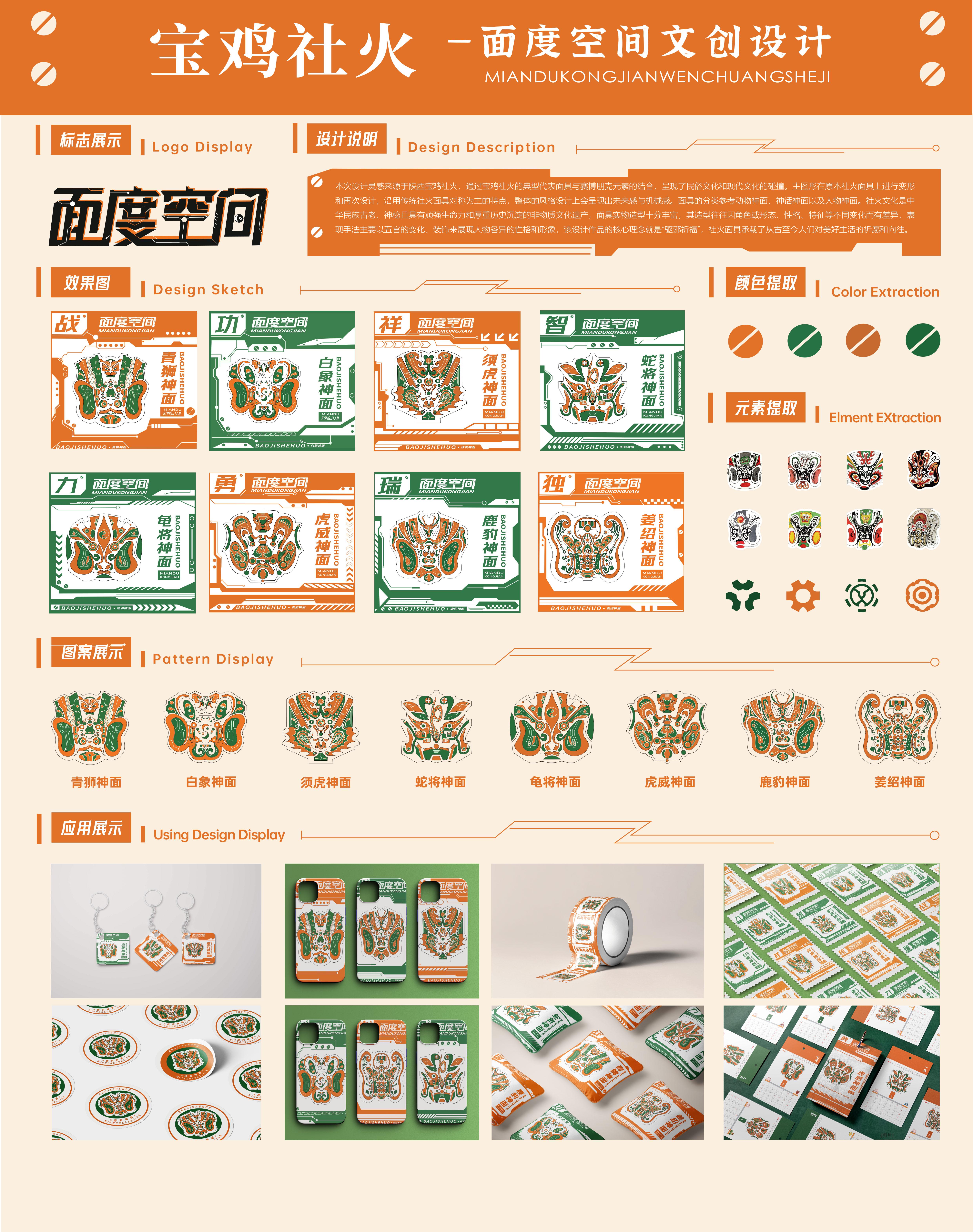 设计灵感来源于陕西宝鸡社火,代表面具与赛博朋克元素的结合,呈现了民俗文化和现代文化的碰撞。主图形在原本社火面具上进行变形和再次设计,沿用传统社火面具对称为主的特点,风格设计上未来感与机械感。核心理念“驱邪祈福”,将传统社火面具和现代赛博朋克相结合也是一种传播传统文化的方式,以一种新奇的角度将社火文化映入日常生活中,以此达到宣扬传统文化的目的。