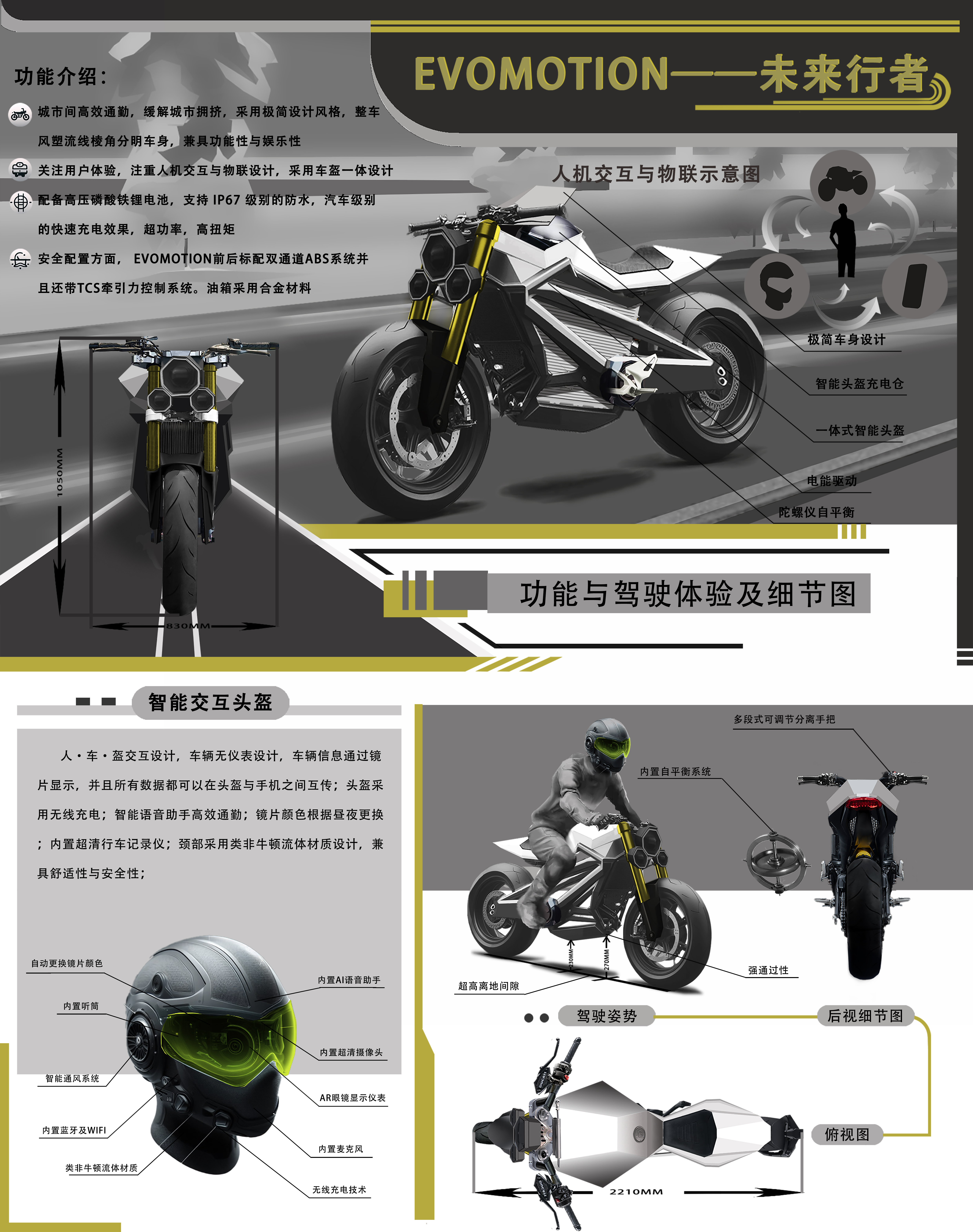 EvoMotion——未来行者是基于当先与未来科技应用与能源发展的智慧出行解决方案,关注用户体验,实现人与车辆·头盔·手机之间的物联,旨在提供和卓越的可持续性与便捷性。通过创新的交通工具设计和智能化技术的应用,EvoMotion将为人们带来便捷、环保的出行方式。缓解城市间交通拥堵,推动城市交通的可持续发展。