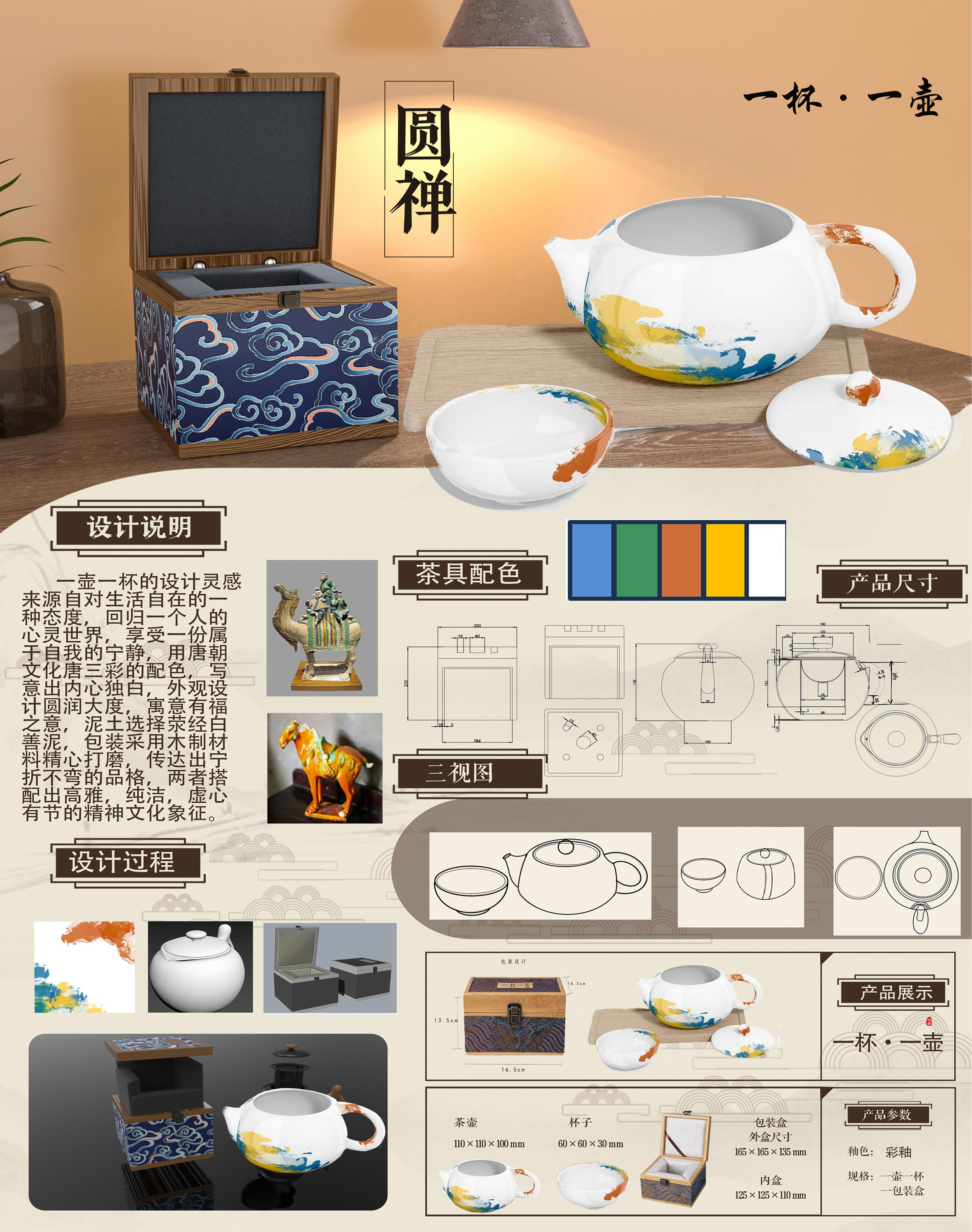 唐朝文化源远流长,素来著有“古都”的陕西的陕西历史博物馆也珍藏了许多文物,而唐三彩更是唐代陶器中的精华,此次文创产品“圆禅”就是提取唐三彩的主要配色来进行图案纹样的变形设计,将唐三彩的颜色通过彩釉低温烧制,该款茶具有一个茶壶和一个茶杯构成,茶具的包装也提取唐代的宝相花纹进行加工变形, 茶壶一改平时的庄重,呆板,千篇一律,鲜艳的颜色也使其更具活力感。实现传统与现代碰撞的独特美学理念。