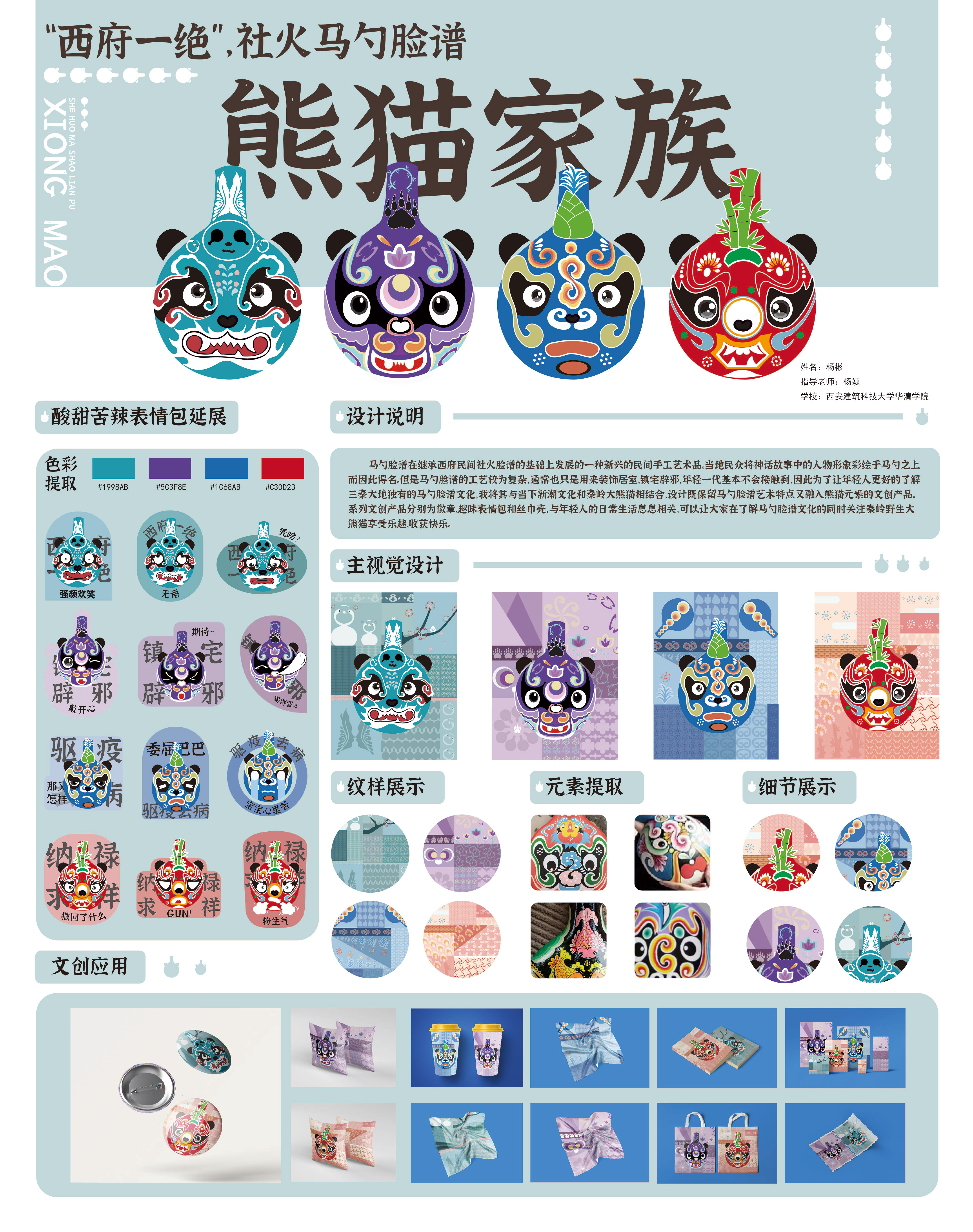 马勺脸谱,当地民众将神话故事中的人物形象彩绘于马勺之而因此得名。但是马勺脸谱的工艺较为复杂,通常也只是用来装饰居室、镇宅辟邪,我将其与当下新潮文化和秦岭大熊猫相结合,设计既保留马勺脸谱艺术特点又融入能猫元素的文创产品系列文创产品分别为徽章趣味表情包和丝巾,与年轻人的日常生活息息相关可以让大家在了解马勺脸谱文化的同时关注奏岭野生熊猫享受乐趣,收获快乐。