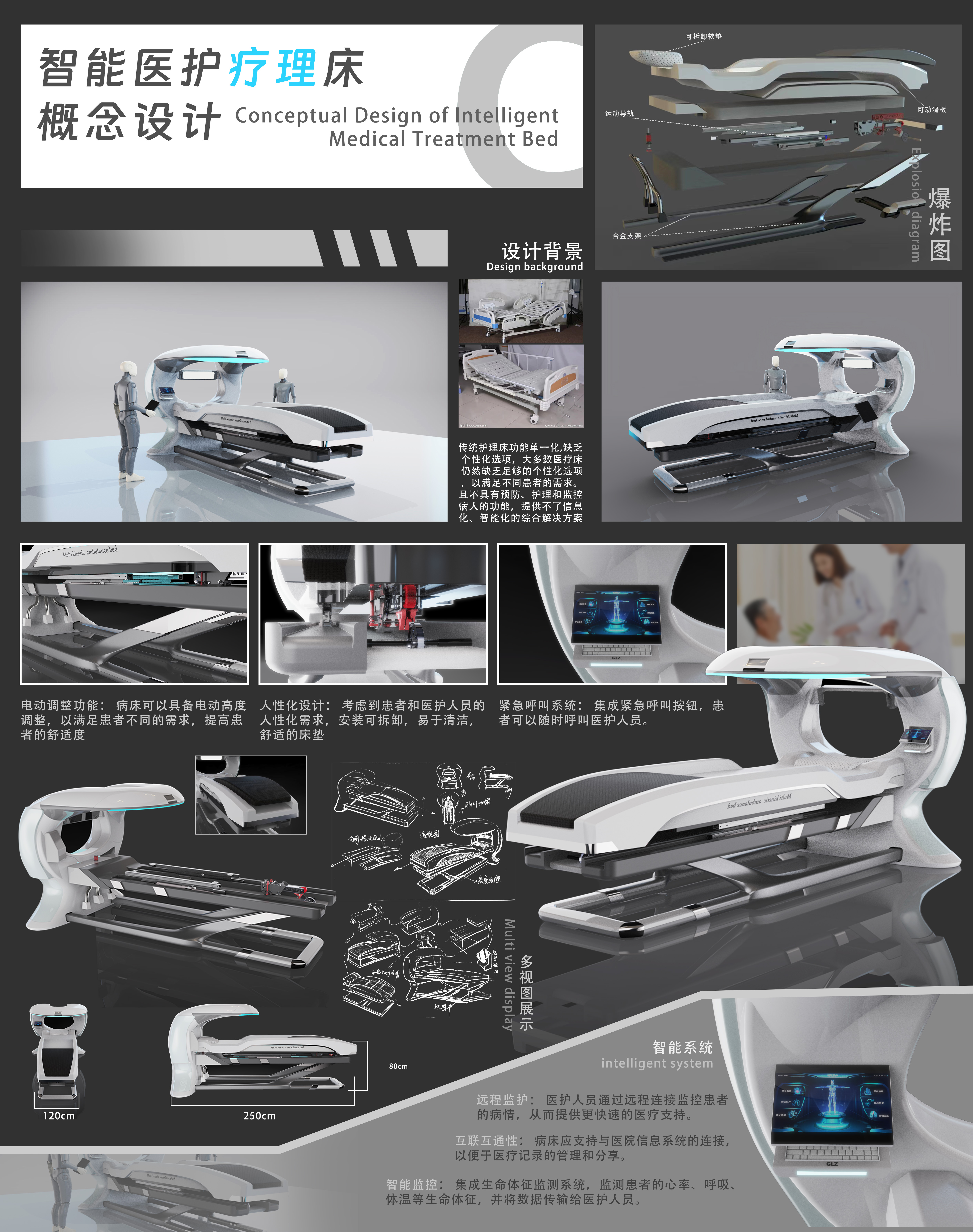 智能理疗床的设计是医院、诊所和其他医疗机构中用于为患者提供治疗和康复的设施。集成生命体征监测系统,监测患者的心率、呼吸、体温等生命体征,并将数据传输给医护人员。医疗床概念设计应综合考虑功能性、舒适性、安全性、可调节性、空间利用、美观性、环保性和经济性等多个方面,以满足医疗机构和患者的需求。