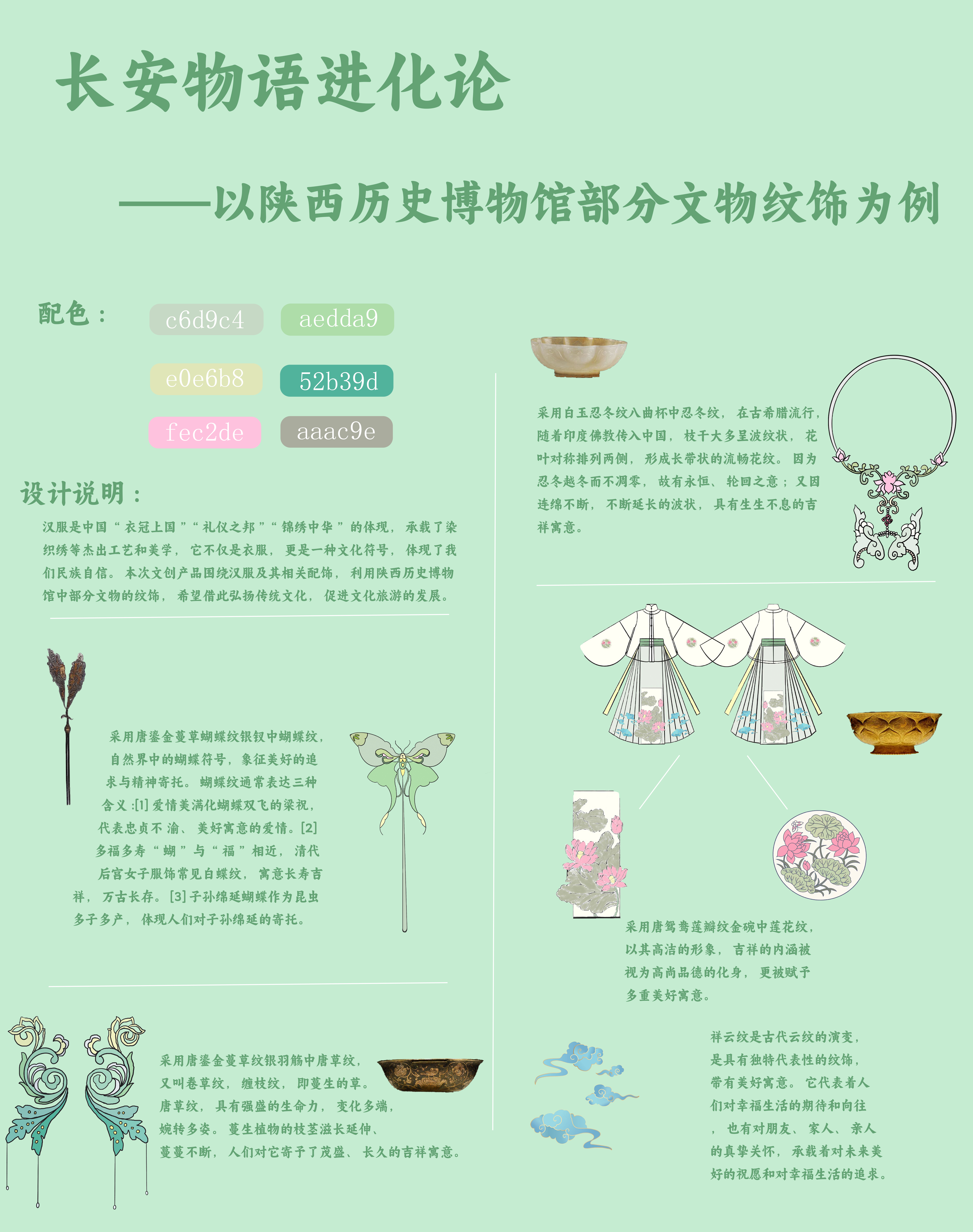 汉服是中国“衣冠上国”“礼仪之邦”“锦绣中华”的体现,承载了染织绣等杰出工艺和美学,它不仅是衣服,更是一种文化符号,体现了我们民族自信。本次文创产品围绕汉服及其相关配饰,利用陕西历史博物馆中部分文物的纹饰,希望借此弘扬传统文化,促进文化旅游的发展。