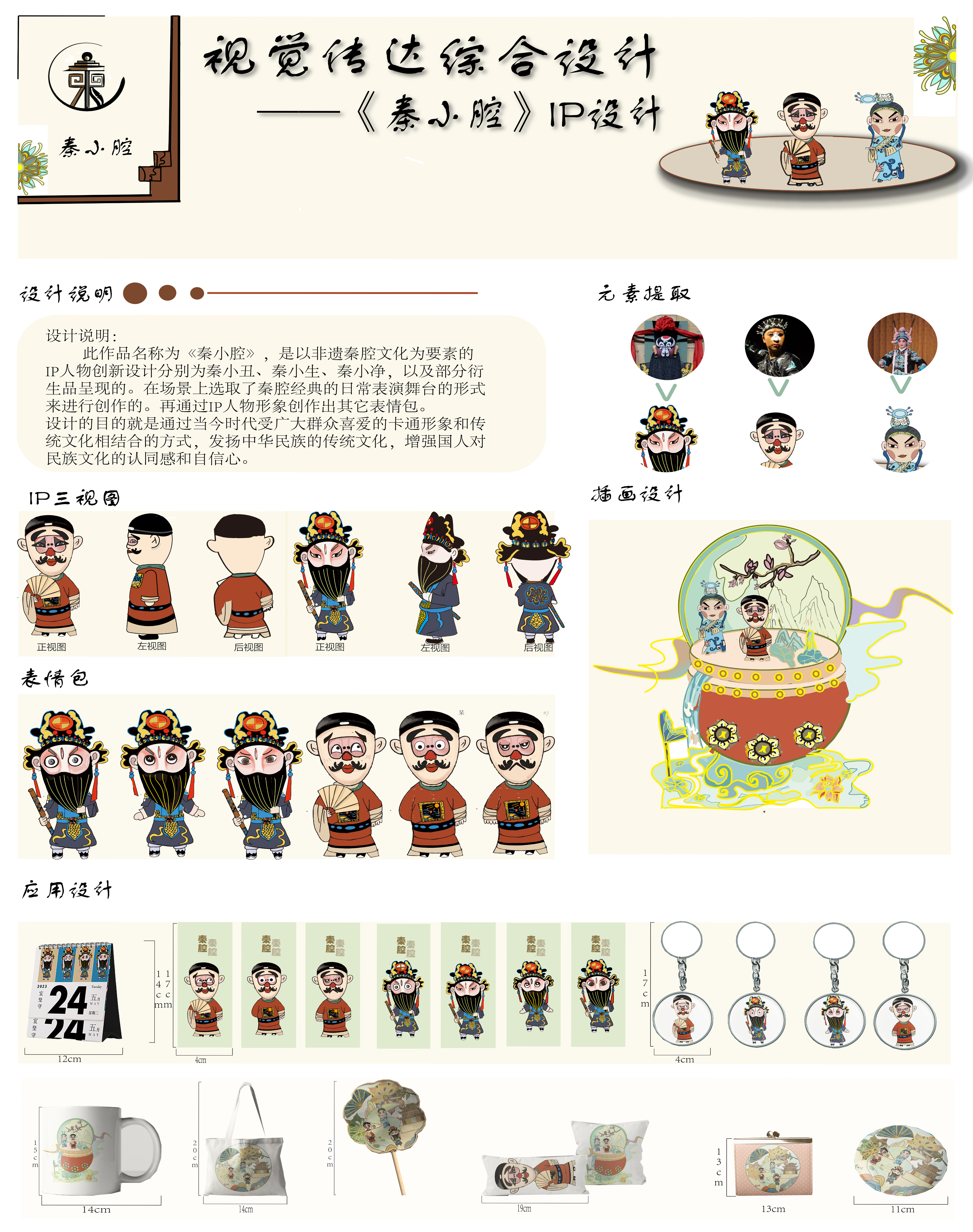 此作品名称为《秦小腔》,是以非遗秦腔文化为要素的 IP人物创新设计分别为秦小丑、秦小生、秦小净,以及部分衍 生品呈现的。在场景上选取了秦腔经典的日常表演舞台的形式来进行创作的。再通过IP人物形象创作出其它表情包。设计的目的就是通过当今时代受广大群众喜爱的卡通形象和传统文化相结合的方式,发扬中华民族的传统文化,增强国人对 民族文化的认同感和自信心。