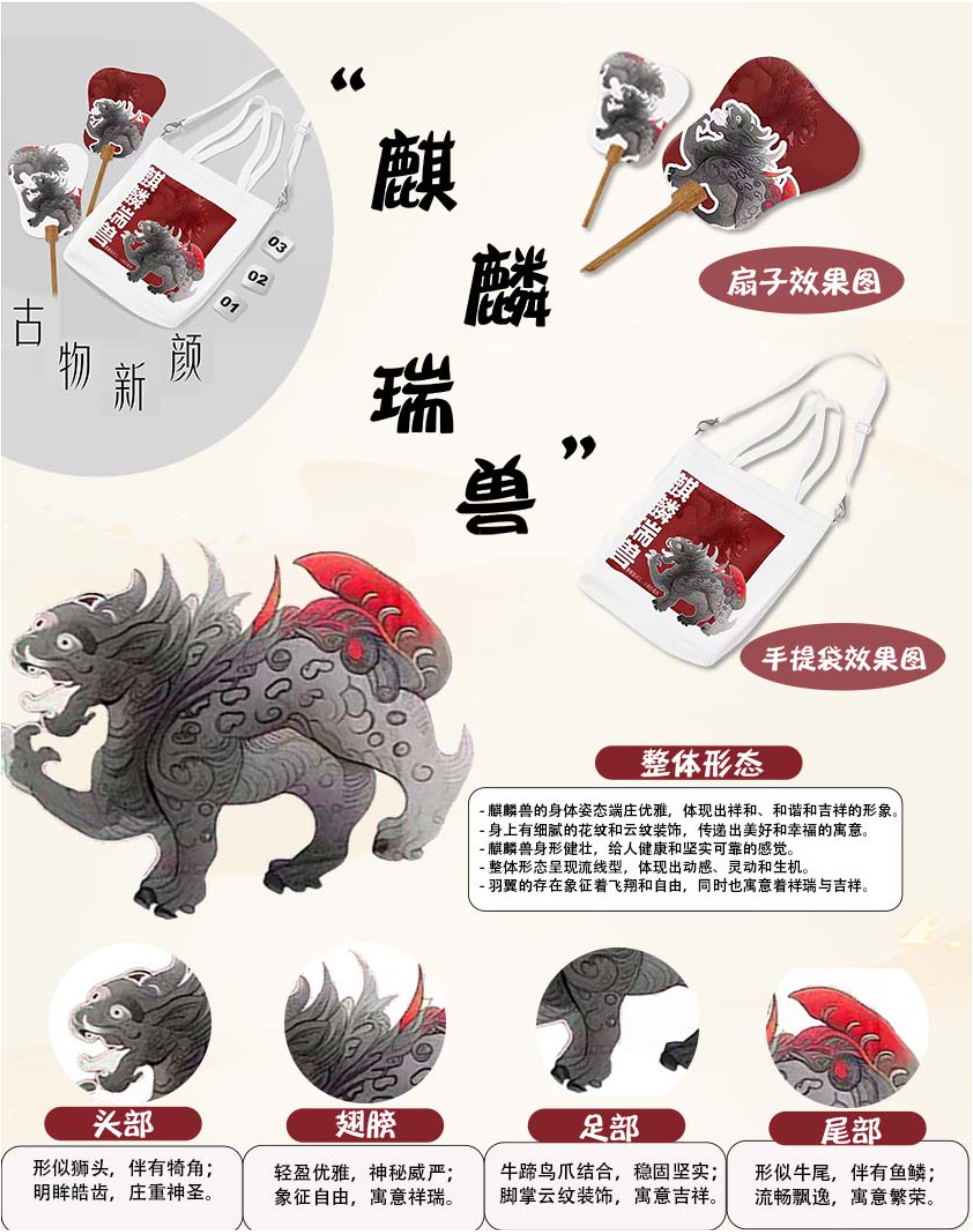 麒麟兽在中国文化中具有深远的意义,富含祥瑞吉祥、保护驱邪、圣洁善良、繁荣财富等美好含义。 麒麟兽常被认为是祥瑞之兽。麒麟兽在中国文化中代表着吉祥、祥瑞、保护和幸福。其形象和意义广泛应用于建筑、艺术、文物和日常生活中,体现了人们对美好未来的追求。 团队依据陕西有关麒麟兽的文物和相关记载,结合创新创意,现呈现出麒麟兽的体态和样貌,并设计有关手提包和扇子,旨在传承中华传统优秀文化,给大家带来美好寓意。