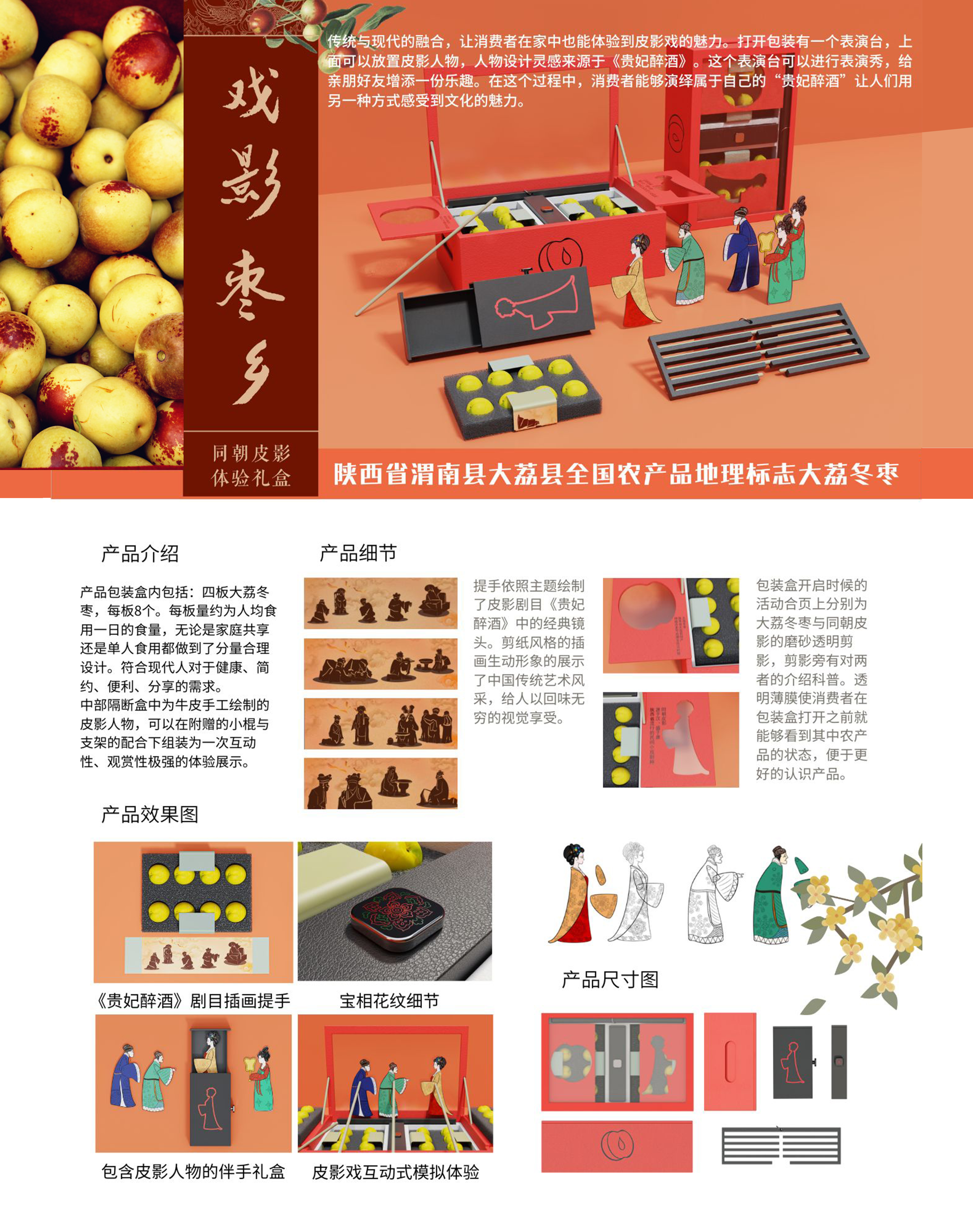 大荔县是陕西的需扶贫对象,这次设计的助农礼盒是给大荔特产大荔冬枣进行的精准农产品包装设计。这是传统与现代的融合,让消费者在家中也能体验到皮影戏的魅力。打开包装有一个表演台,上面可以放置皮影人物,人物设计灵感来源于《贵妃醉酒》。这个表演台可以进行表演秀,给亲朋好友增添一份乐趣。在这个过程中,消费者能够演绎属于自己的“贵妃醉酒”让人们用另一种方式感受到文化的魅力。