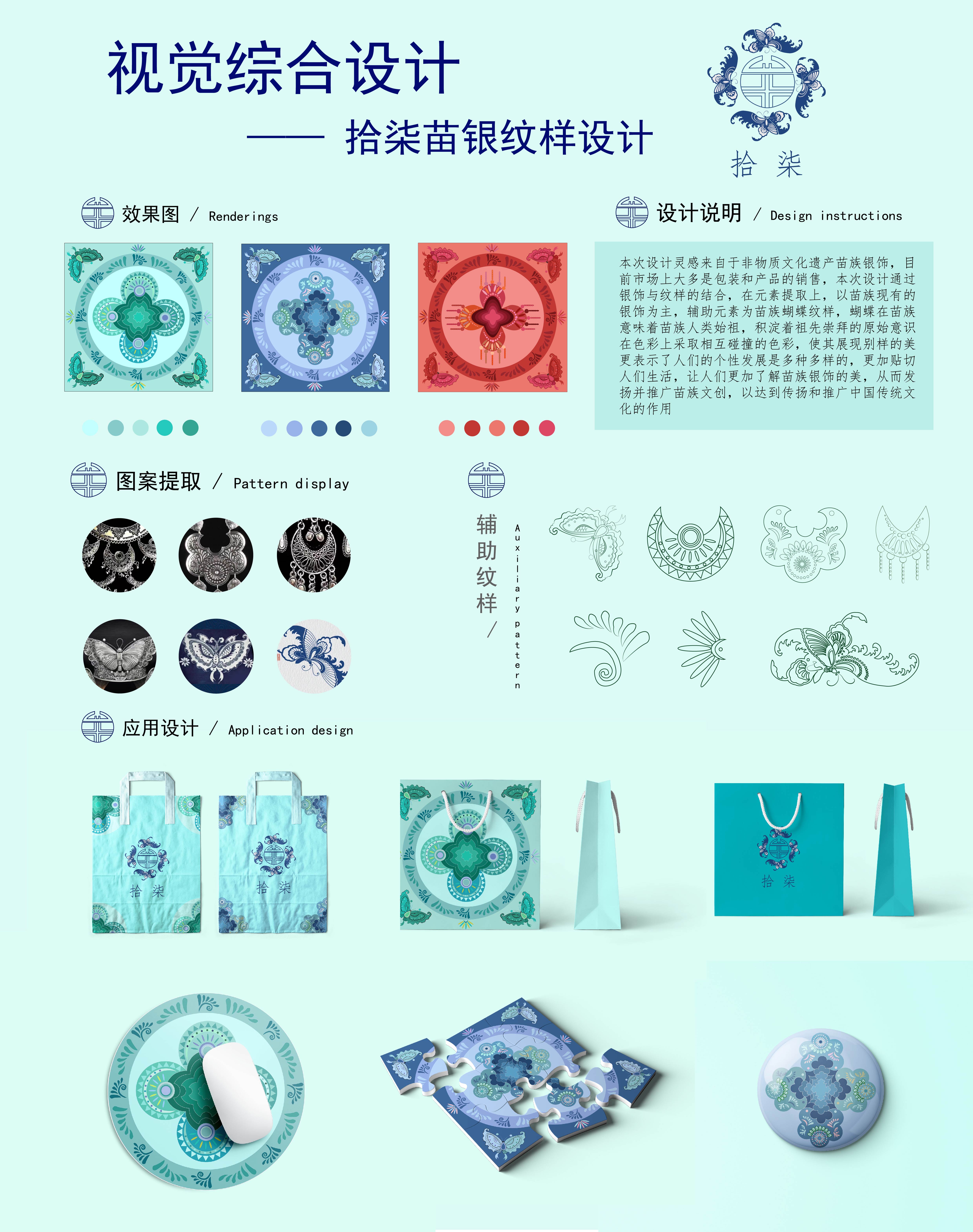 本次设计灵感来自于非物质文化遗产苗族银饰,本次设计通过银饰与纹样的结合,在元素提取上,以苗族现有的银饰为主,辅助元素为苗族蝴蝶纹样,蝴蝶在苗族意味苗族人类始祖,积淀着祖先崇拜的原始意识在色彩上采取相互碰撞的色彩,使其展现别样的美,更表示了人们的个性发展是多种多样的,更加贴切人们生活,让人们更加了解苗族银饰的美,从而发扬并推广苗族文创,以达到传扬和推广中国传统文化的作用。