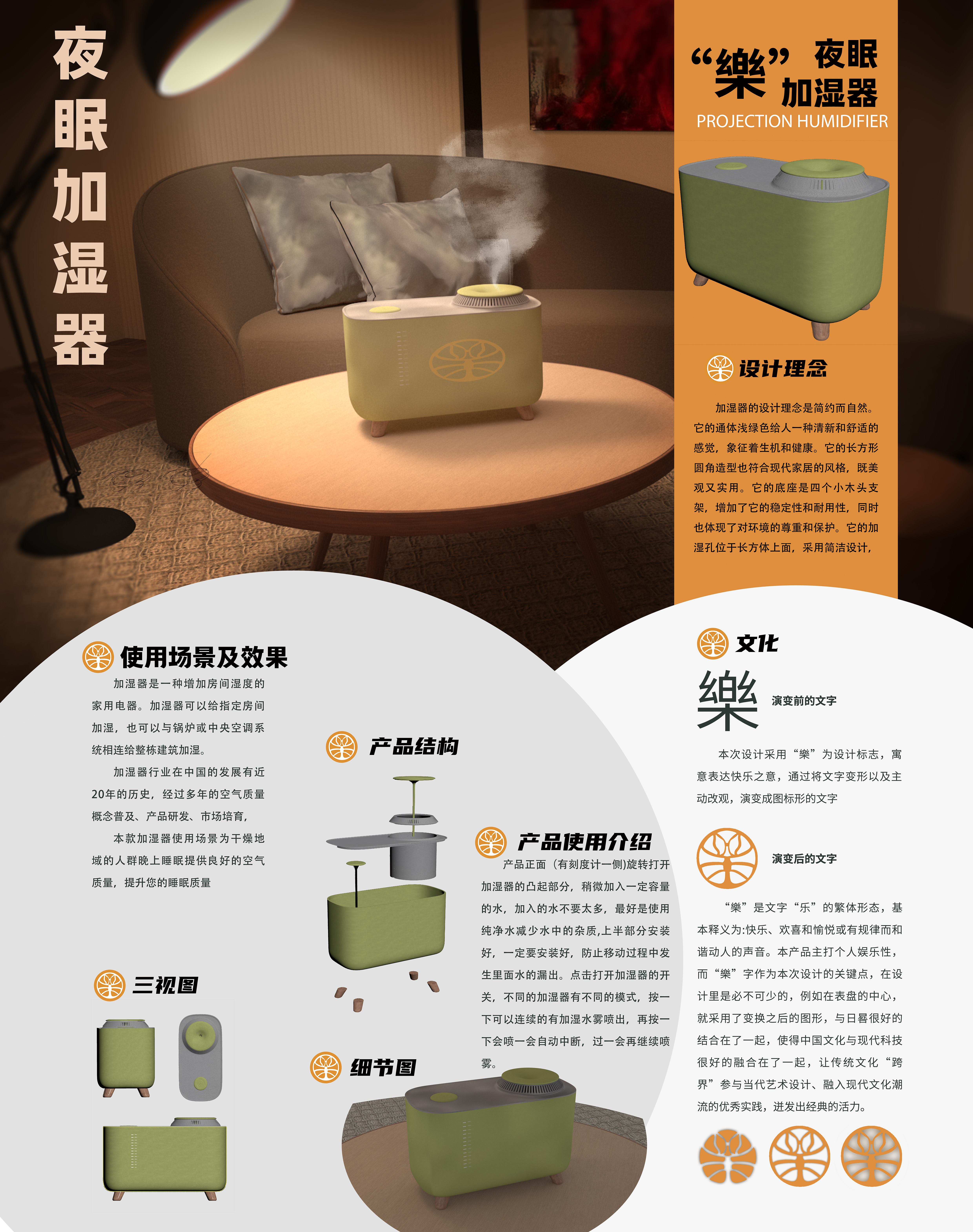 随着大众消费水平提高,人们开始使用加湿器作为提升生活质量的家用小电器,夜眠加湿器应运而生,他简约而自然的形态与颜色能够相比其他加湿器跟能融入现代的家装环境,通体浅绿色象征着升级与健康,简单明了的刻度与按键能让人快速上手,减少学习成本。