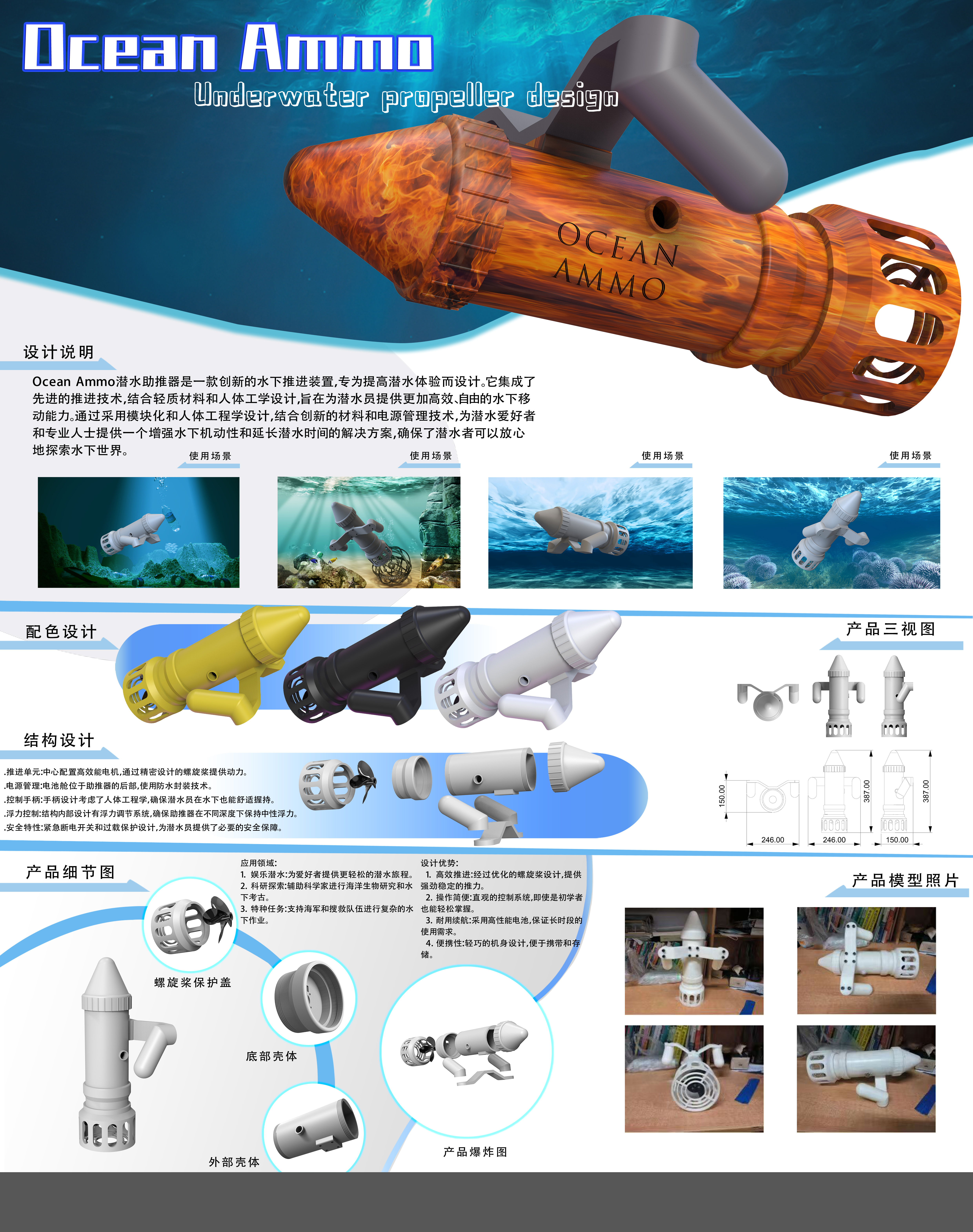 Ocean Ammo潜水助推器是一款创新的水下推进装置,专为提高潜水体验而设计。它集成了先进的推进技术,结合轻质材料,通过采用模块化和人体工程学设计,结合创新的材料和电源管理技术,为潜水爱好者和专业人士提供一个增强水下机动性和延长潜水时间的解决方案,在安全性、便携性和维护方面均能提供卓越的表现,模块化的设计也使得每个部分都易于拆卸,以便于速修理或更换,带给了潜水者水下探索之旅的良好体验。