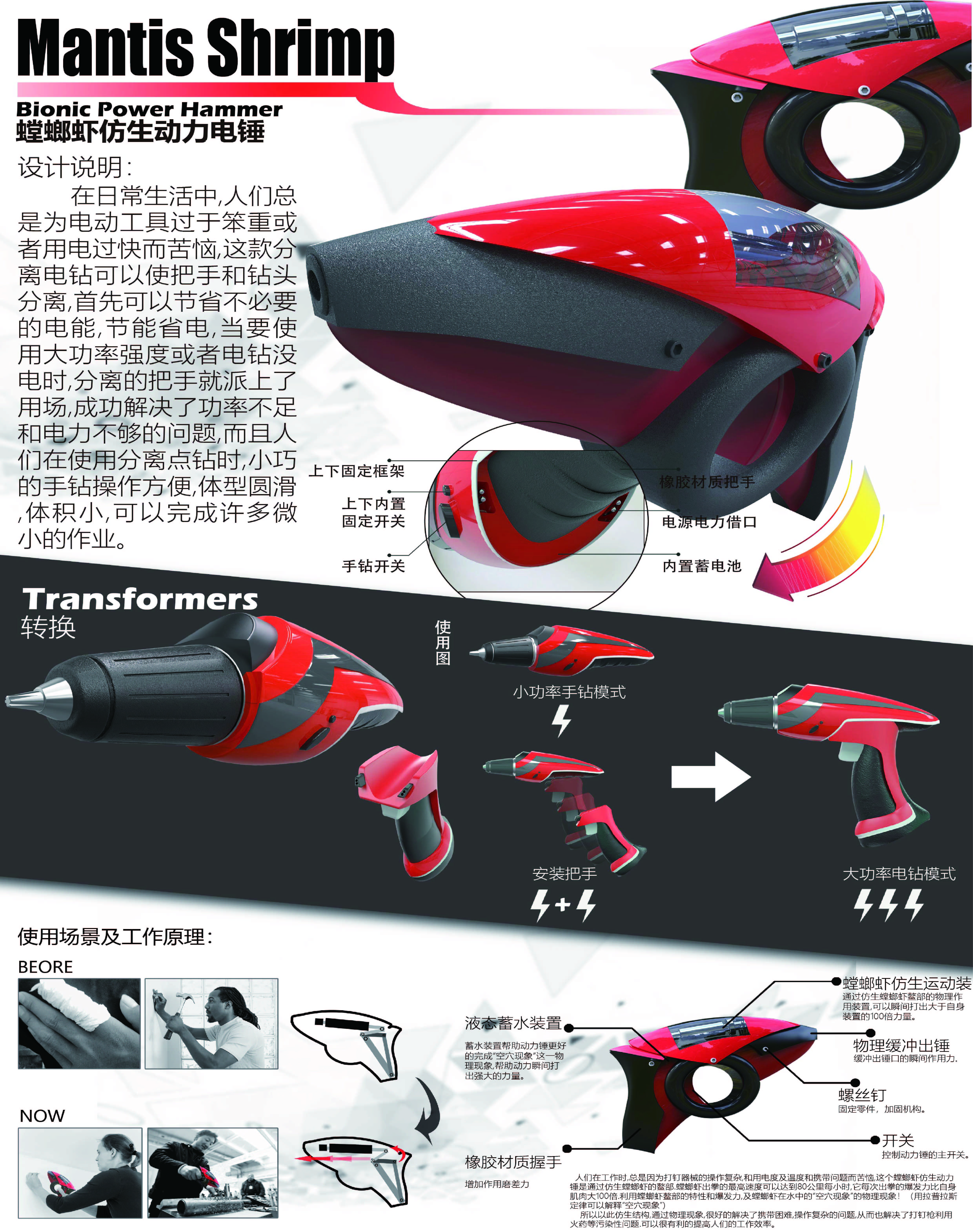 打钉装备工作时伴随着操作复杂、耗电、高温和携带不便的问题。螳螂虾出拳的最高速度可以达到80公里每小时,是因为其在水中的“空穴现象”,其背后原理为拉普拉斯定律,让他它每次出拳产生了惊人爆发力。本设计通过仿生螳螂虾的鳌形态,以此仿生结构,通过物理现象,解决了携带困难操作复杂的问题,从而也解决了打钉枪利用火药等污染性问题,可以很有利的提高人们的工作效率。