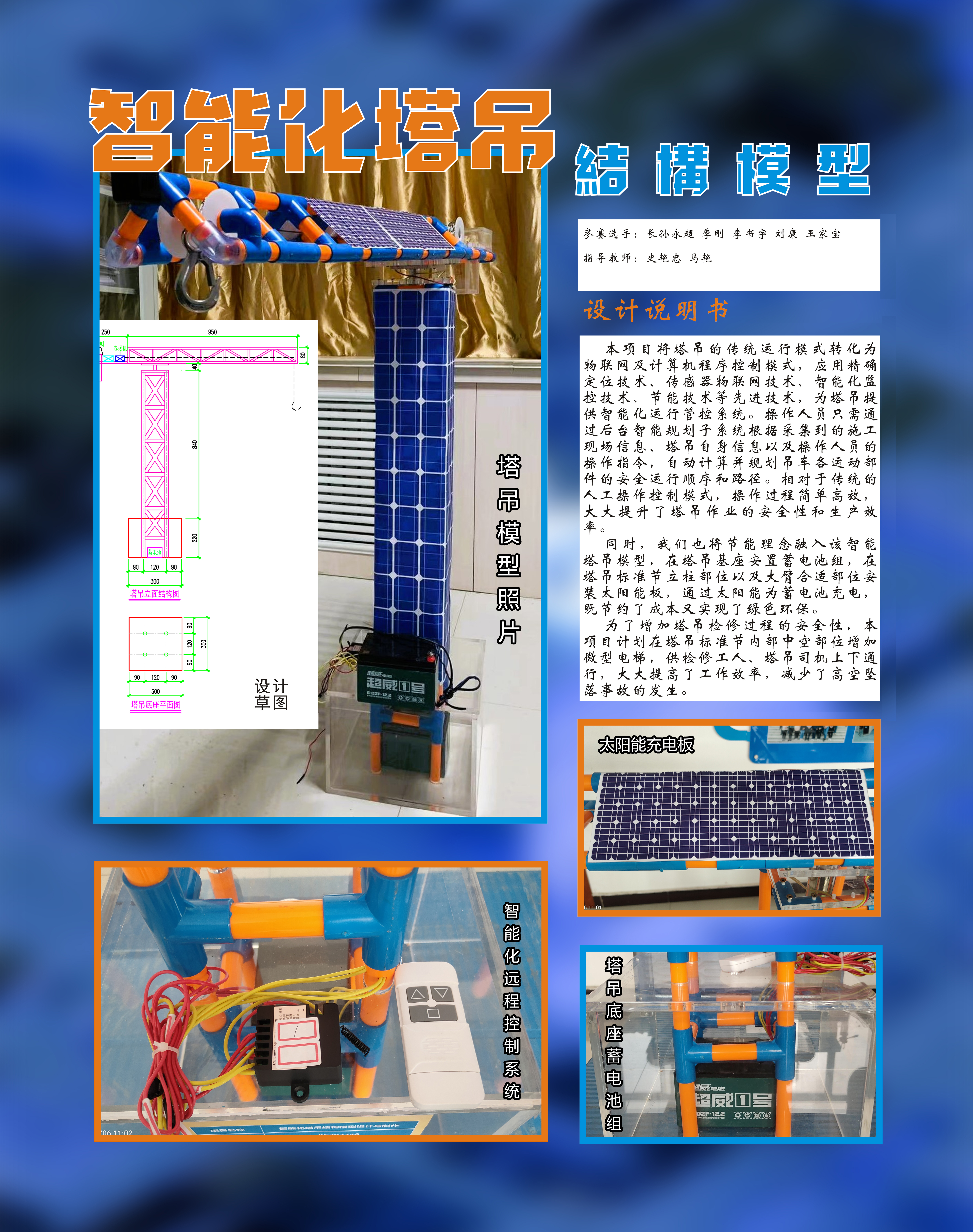 本项目将塔吊的传统运行模式转化为物联网及计算机程序控制模式,应用精确定位技术等多种先进技术,为塔吊提供智能化运行管控系统,实现了智能化与远程操控,提高了塔吊运行的安全性。同时,我们也将节能理念融入该智能塔吊模型,在塔吊基座安置蓄电池组,在塔吊标准节立柱部位以及大臂合适部位安装太阳能板,通过太阳能为蓄电池充电,既节约了成本又实现了绿色环保。