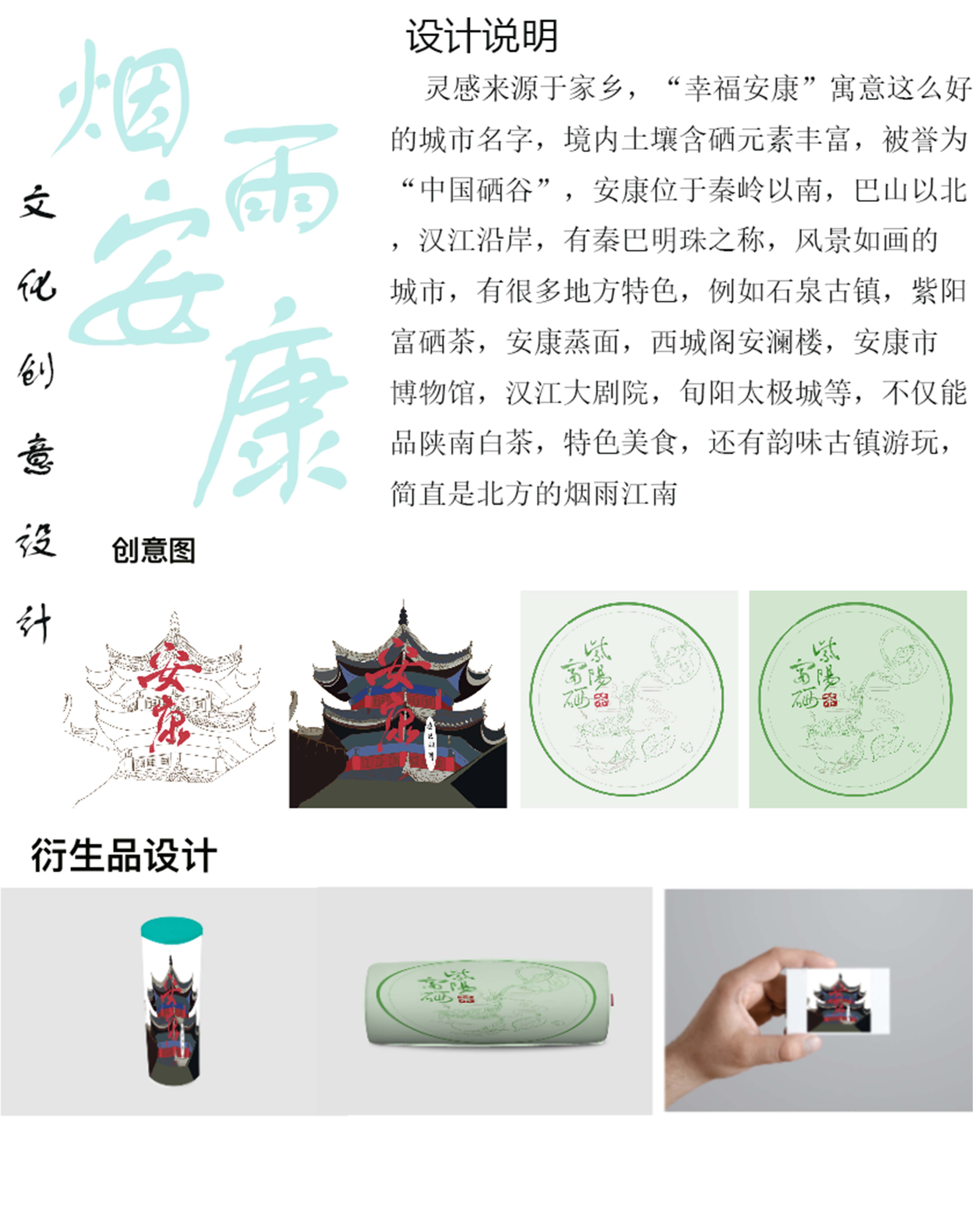 设计说明 灵感来源于家乡,“幸福安康”寓意这么好的城市名字,境内土壤含硒元素丰富,被誉为“中国硒谷”,安康位于秦岭以南,巴山以北,汉江沿岸,有秦巴明珠之称,风景如画的城市,有很多地方特色,例如石泉古镇,紫阳富硒茶,安康蒸面,西城阁安澜楼,安康市博物馆,汉江大剧院,旬阳太极城等,不仅能品陕南白茶,特色美食,还有韵味古镇游玩,简直是北方的烟雨江南