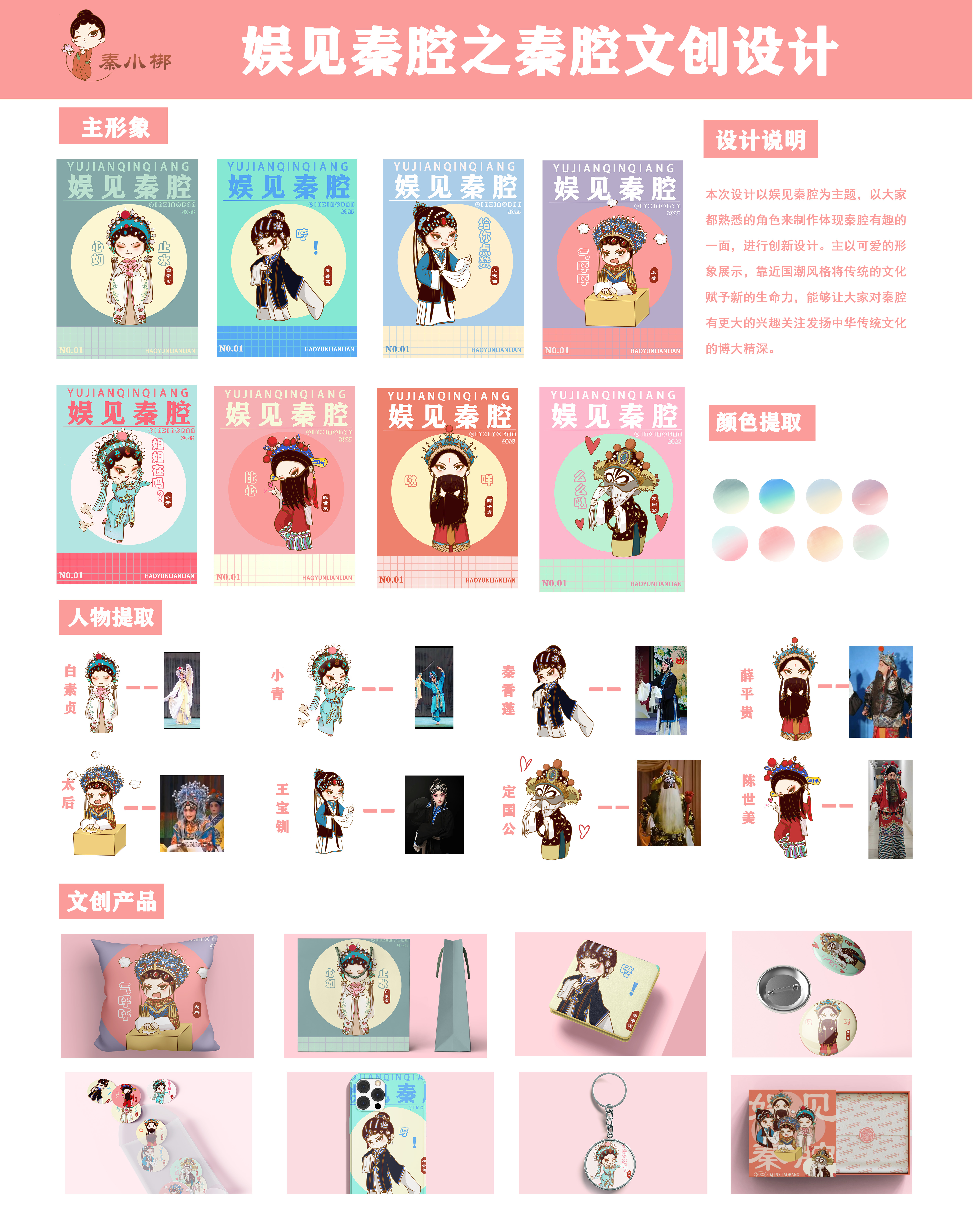本次设计以“娱见秦腔”为主题,使用秦腔戏曲中大家都耳熟能详的角色作为主体,来制作体现秦腔有趣的一面。从画风上看,主要以可爱的形象展示、风格都是靠近国潮将传统的文化赋予新的生命力,新型的Q版人物和传统文化的碰撞感受非遗文化,希望通过该设计能够让大家对秦腔有更大的兴趣和关注,发扬中华传统文化的博大精深。