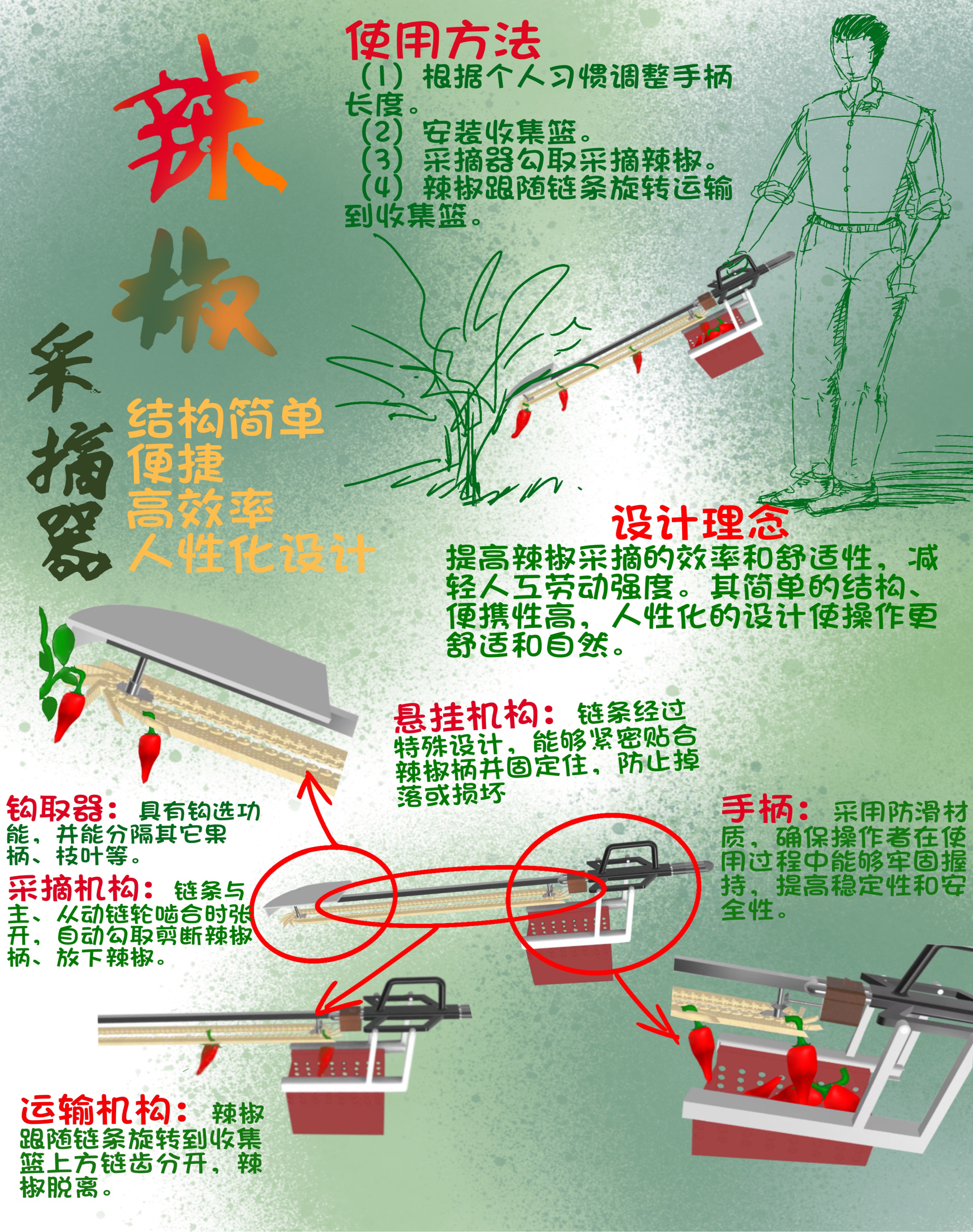 该产品的设计旨在提高辣椒采摘的效率和舒适性,减轻人工劳动强度,最大程度解决椒农长时间弯腰采椒腰疼痛问题。产品所用的链条式采椒方法,主体的链条进行辣椒的夹取采摘,运输,操作简单,具有创新性,实用性。产品整体结构简单,携带便捷,适用于小规模种植使用,同时,半自动化和人性化的设计使得操作更加舒适和自然。相信这款辣椒采摘器将为椒农们带来更多便利,并提升工作效率。