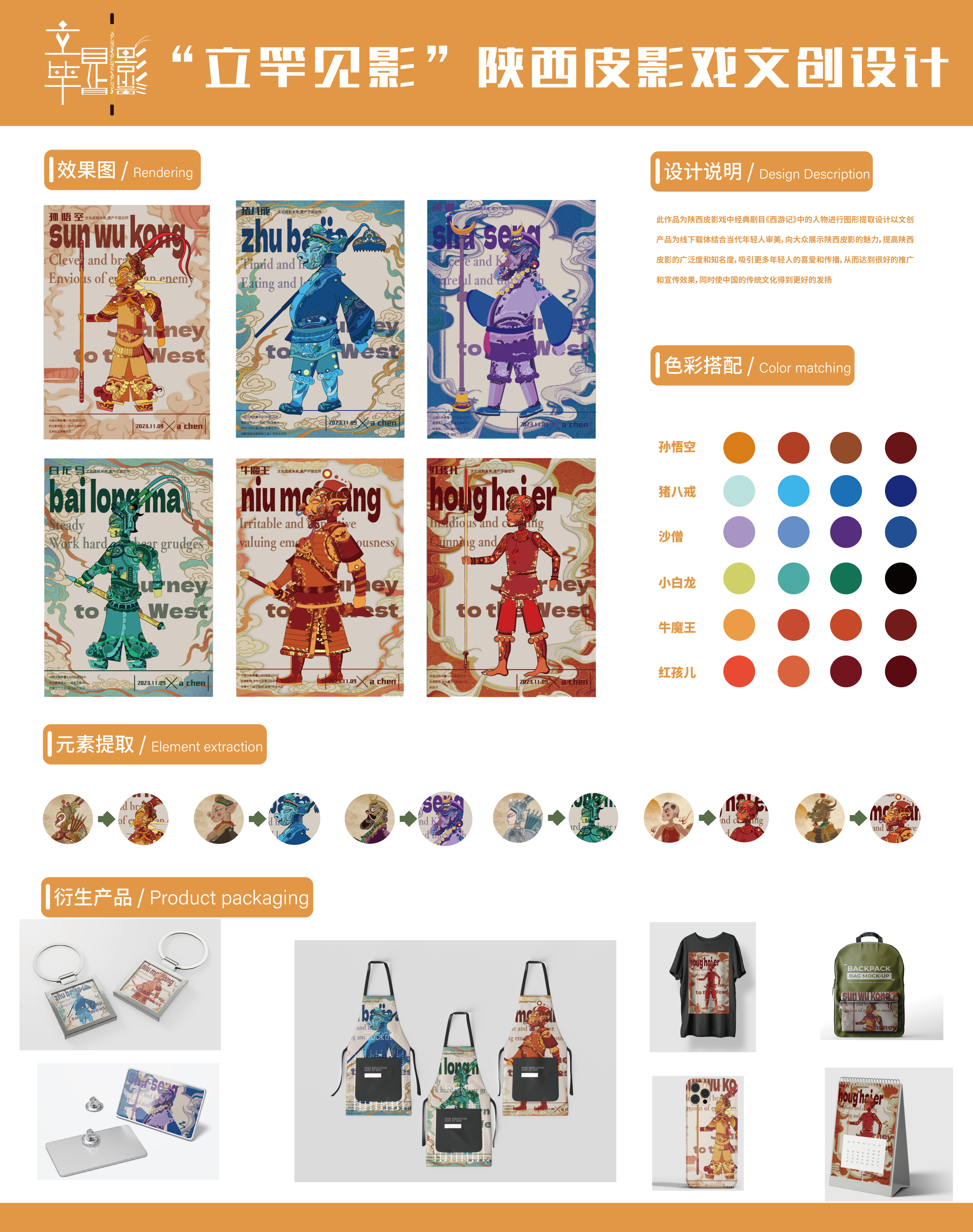 此作品为陕西皮影戏中经典剧目《西游记》中的人物进行图形提取设计以文创产品为线下载体结合当代年轻人审美,向大众展示陕西皮影的魅力,提高陕西皮影的广泛度和知名度,吸引更多年轻人的喜爱和传播,从而达到很好的推广和宣传效果,同时使中国的传统文化得到更好的发扬