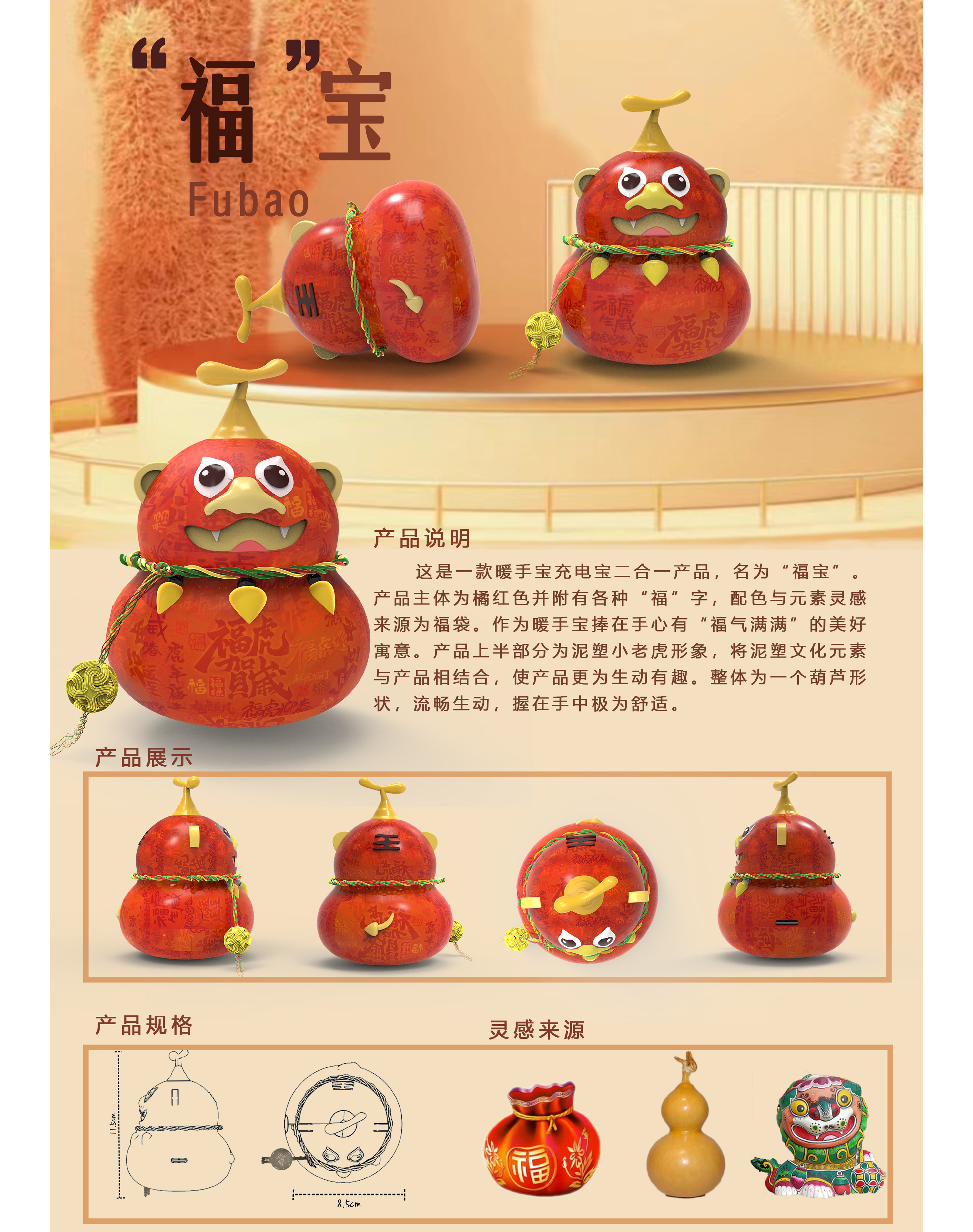 这是一款暖手宝充电宝二合一产品,名为“福宝”。产品主体为橘红色并附有各种“福”字,配色与元素灵感来源为福袋。作为暖手宝捧在手心有“福气满满”的美好寓意。产品上半部分为泥塑小老虎形象,将泥塑文化元素与产品相结合,使产品更为生动有趣。整体为一个葫芦形状,流畅生动,握在手中极为舒适。