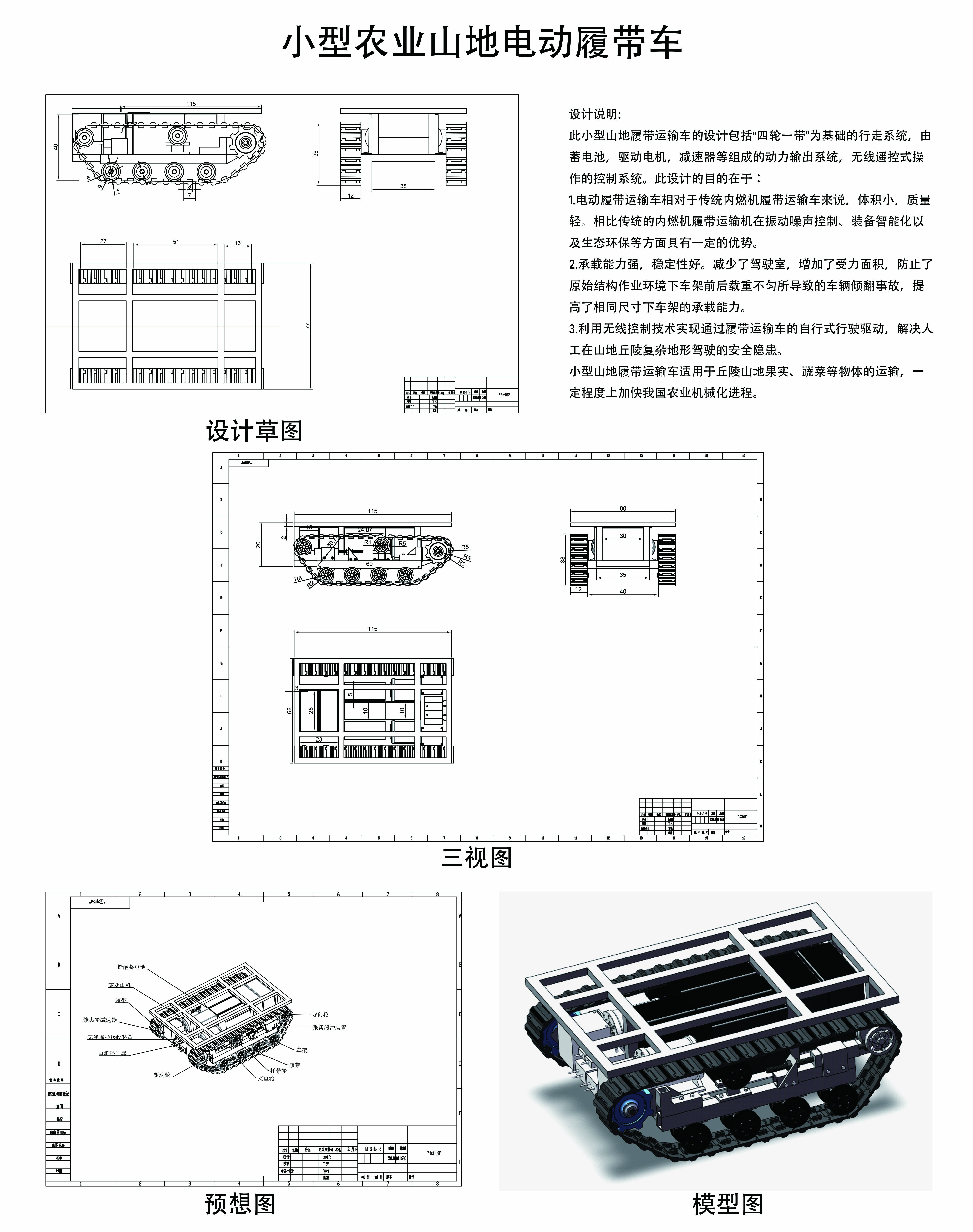 小型山地履带运输车的设计包括由蓄电池,驱动电机,减速器等组成的动力输出系统,无线遥控式操作的控制系统。此设计的目的在于电动履带运输车相对于传统内燃机履带运输车来说,体积小,质量轻。相比传统的内燃机履带运输机在振动噪声控制、装备智能化以及生态环保等方面具有一定的优势。承载能力强,稳定性好。利用无线控制技术实现通过履带运输车的自行式行驶驱动,解决人工在山地丘陵复杂地形驾驶的安全隐患。
