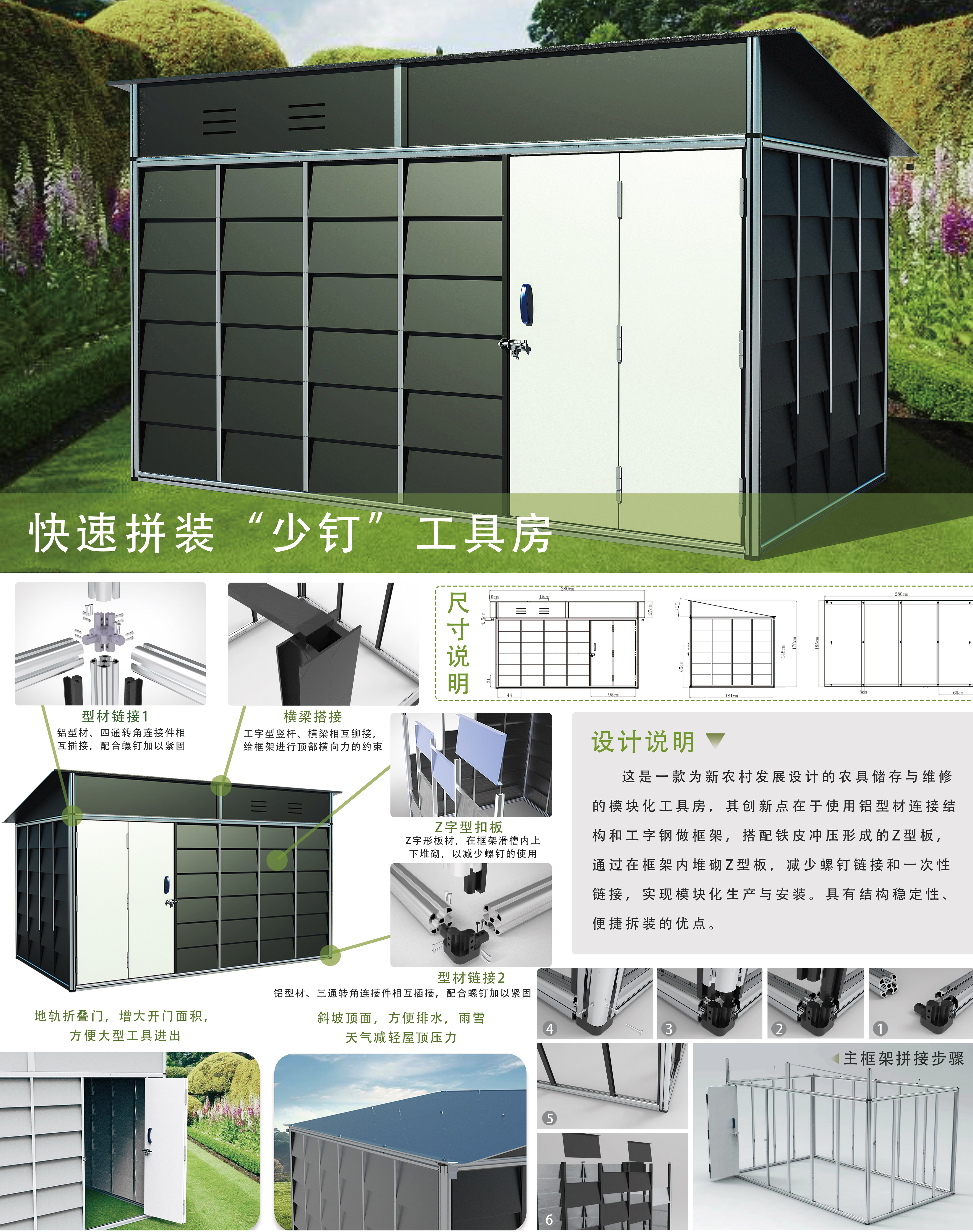 这是一款为新农村发展设计的农具储存与维修的模块化工具房,其创新点在于使用铝型材连接结构和工字钢做框架,搭配铁皮冲压形成的Z型板,通过在框架内堆砌Z型板,减少螺钉链接和一次性链接,实现模块化生产与安装。具有结构稳定性、便捷拆装的优点。