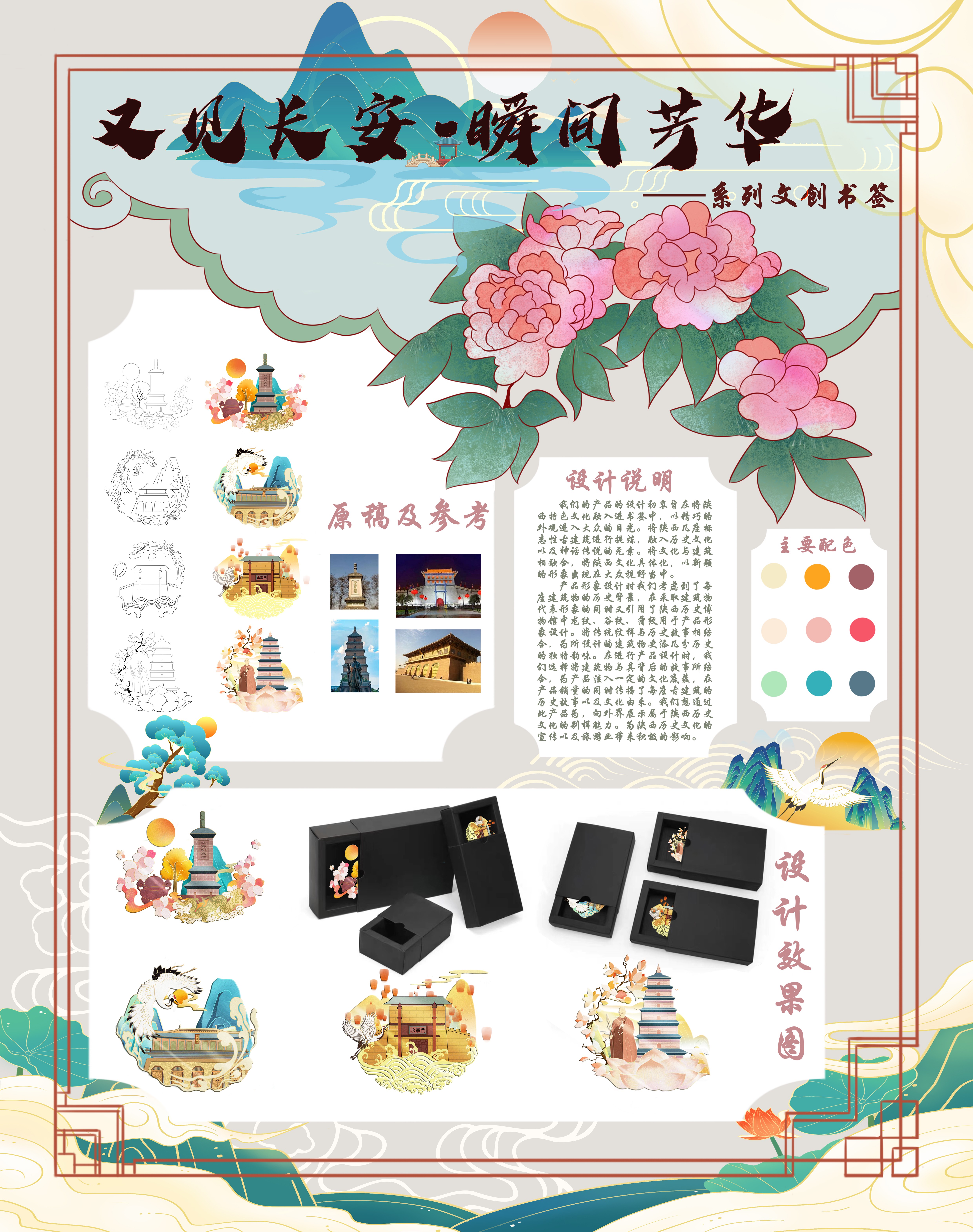 我们的产品的设计初衷旨在将陕西特色文化融入书签中,以精巧的外观进入大众的目光。产品形象设计时我们考虑到了每座建筑的历史背景,且采取建筑物形象的同时又引用了陕西历史博物馆中龙纹、谷纹、蒲纹用于产品形象设计。将传统纹样与历史故事相结合,为产品注入文化底蕴,产品销出的同时阐述每座建筑的历史故事以及文化由来。希望通过此产品为,在展示属于陕西历史文化的魅力同时为陕西历史文化的宣传以及旅游业带来积极的影响。