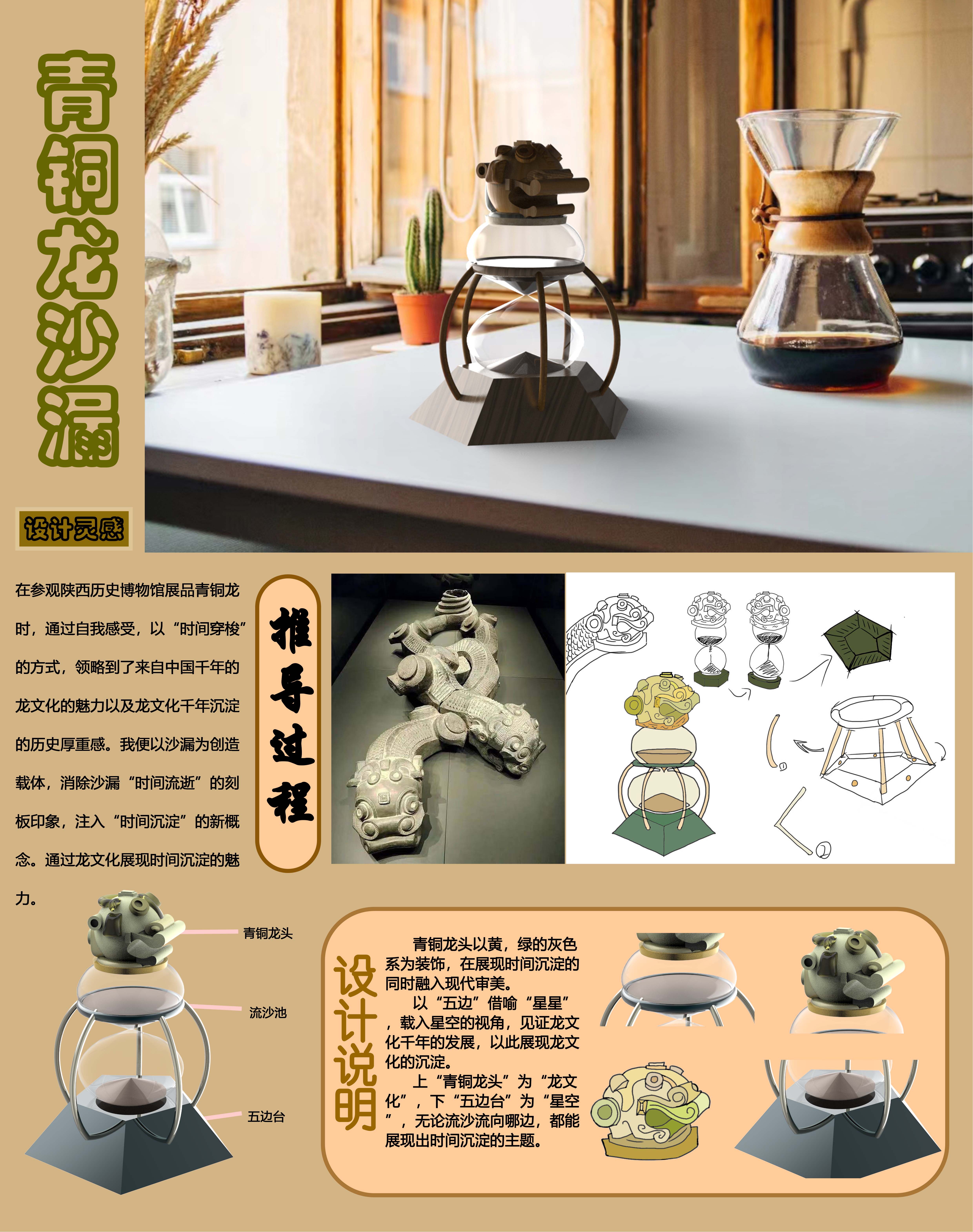 青铜龙头以黄,绿的灰色系为装饰,在展现时间沉淀的同时融入现代审美。以“五边”借喻“星星” ,载入星空的视角,见证龙文化千年的发展,以此展现龙文化的沉淀。上“青铜龙头”为“龙文化”,下“五边台”为“星空”,无论流沙流向哪边,都能展现出时间沉淀的主题。