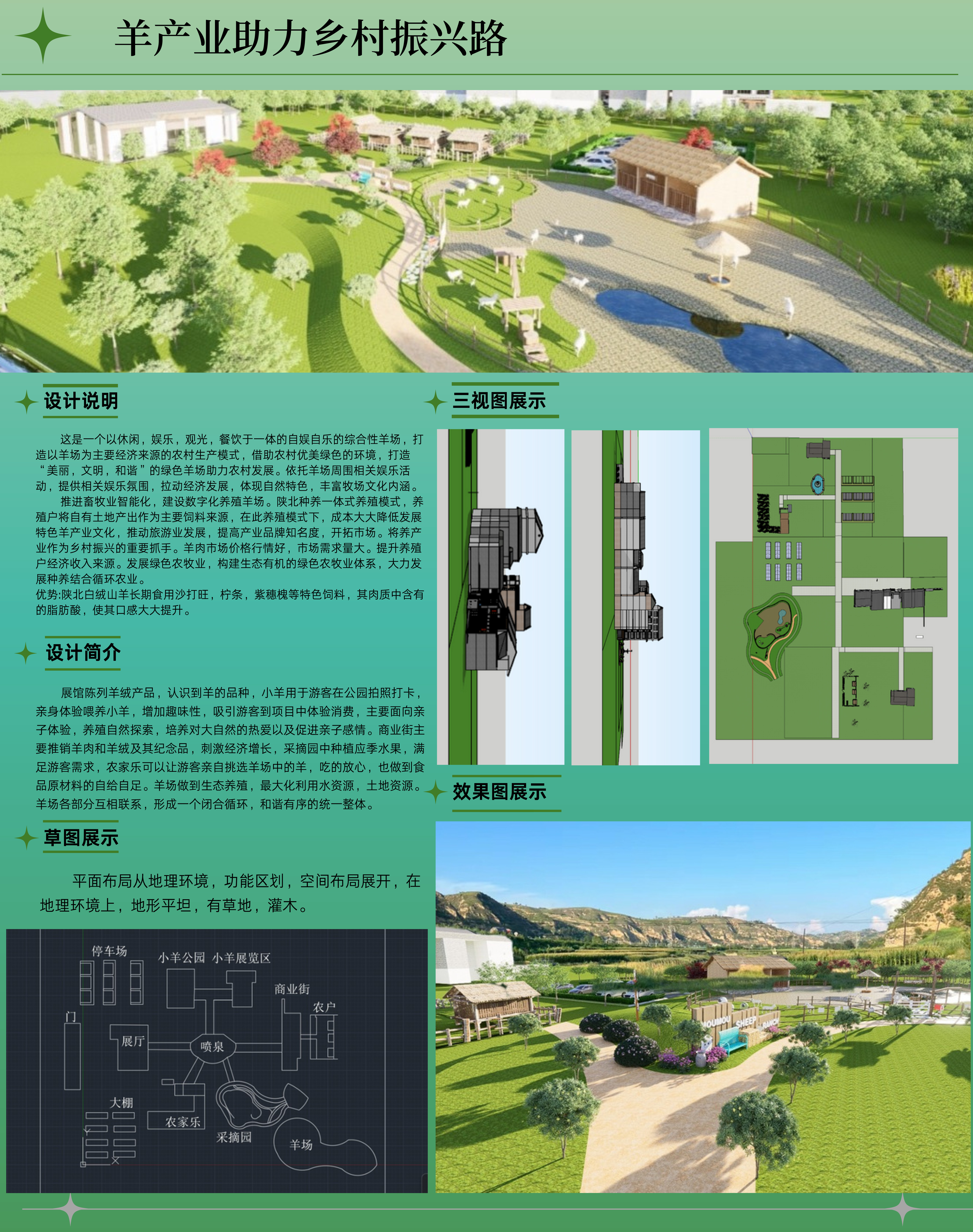 设计以休闲,娱乐,观光,餐饮于一体的综合性羊场,打造以羊场为主要经济来源的农村生产模式,借助农村优美绿色的环境,打造“美丽,文明,和谐”的绿色羊场助力农村发展。依托羊场周围相关娱乐活动,提供相关娱乐氛围,拉动经济发展,体现自然特色,丰富牧场文化内涵。推进畜牧业智能化,建设数字化养殖羊场。发展绿色农牧业,构建生态有机的绿色农牧业体系,大力发展种养结合循环农业。