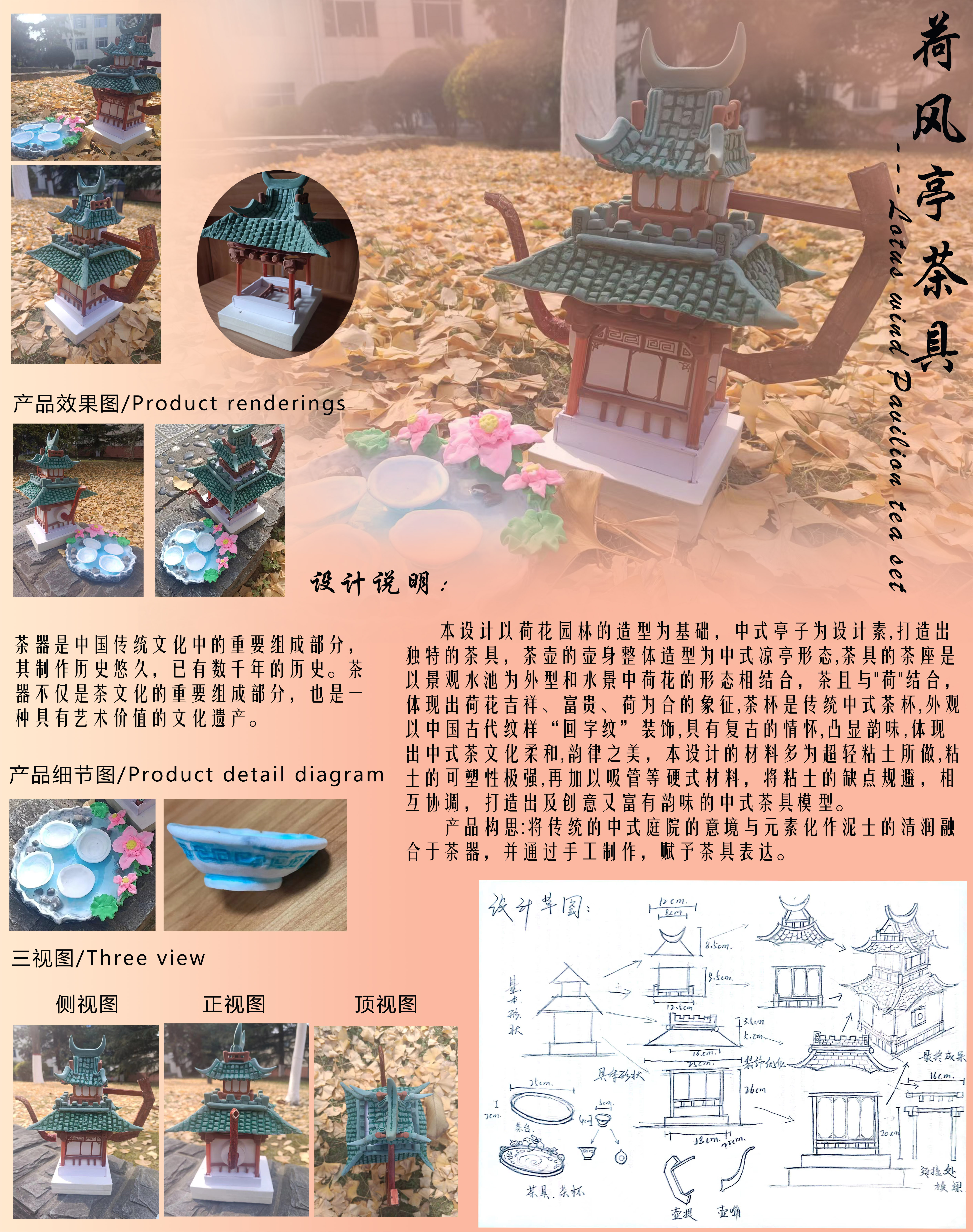 本设计以荷花园林的造型为基础,中式亭子为设计元素,打造出独特的茶具,茶壶的壶身整体造型为中式凉亭形态,茶具的茶座是以景观水池为外型和水景中荷花的形态相结合,茶且与"荷"结合体现出荷花吉祥、富贵、荷为合的象征,荼杯是传统中式茶杯,外观可以中国古代纹样“回字纹”装饰,具有复古的情怀及韵味,体现出中式茶文化柔和、韵律之美,将传统的中式庭院意境与元素化作泥士的清润融合于茶器,并通过手工制作,赋予茶具表达。