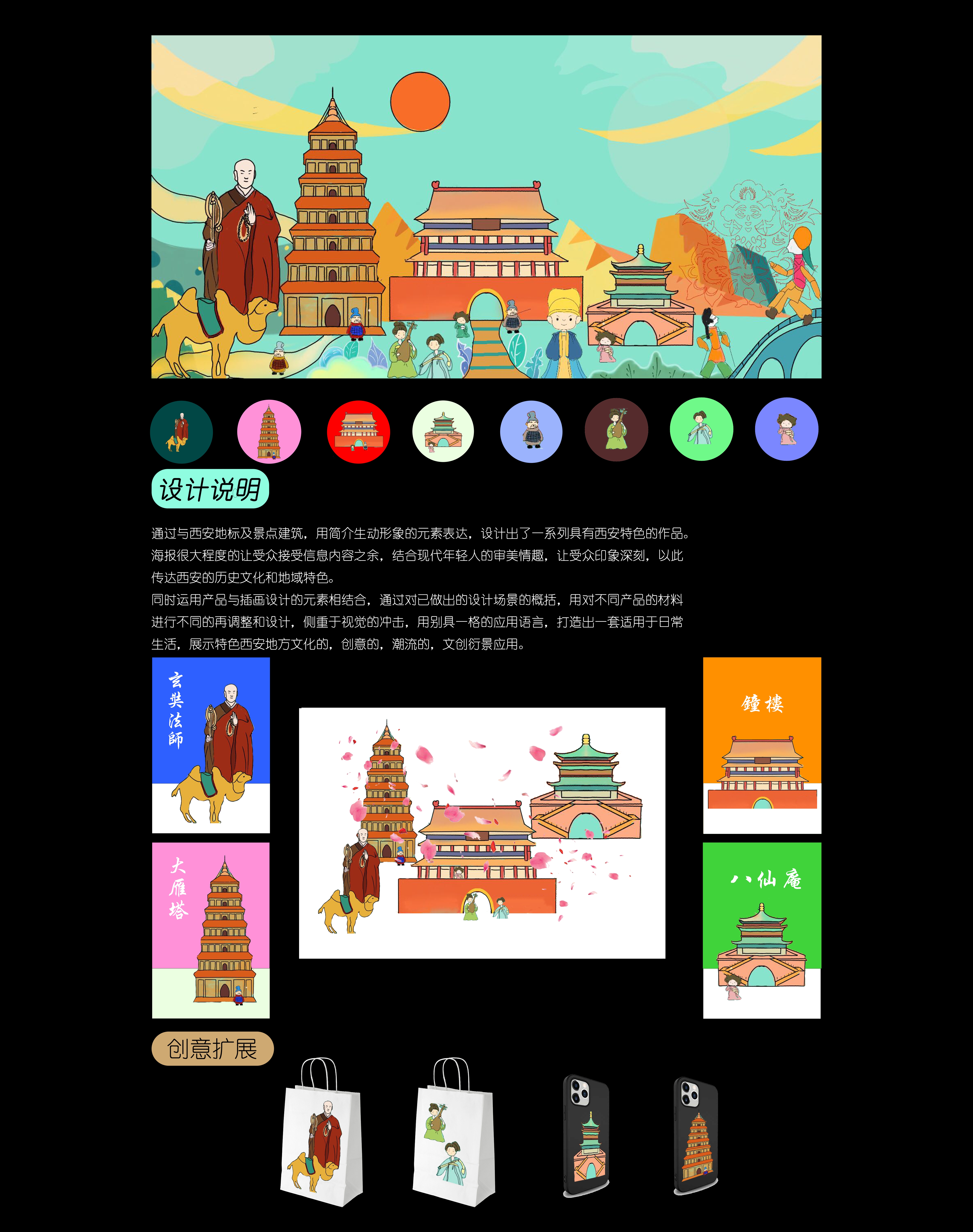 通过与西安地标及景点建筑,用简介生动形象的元素表达,设计出了一系列具有西安特色的作品。海报很大程度的让受众接受信息内容之余,结合现代年轻人的审美情趣,让受众印象深刻,以此传达西安的历史文化和地域特色。