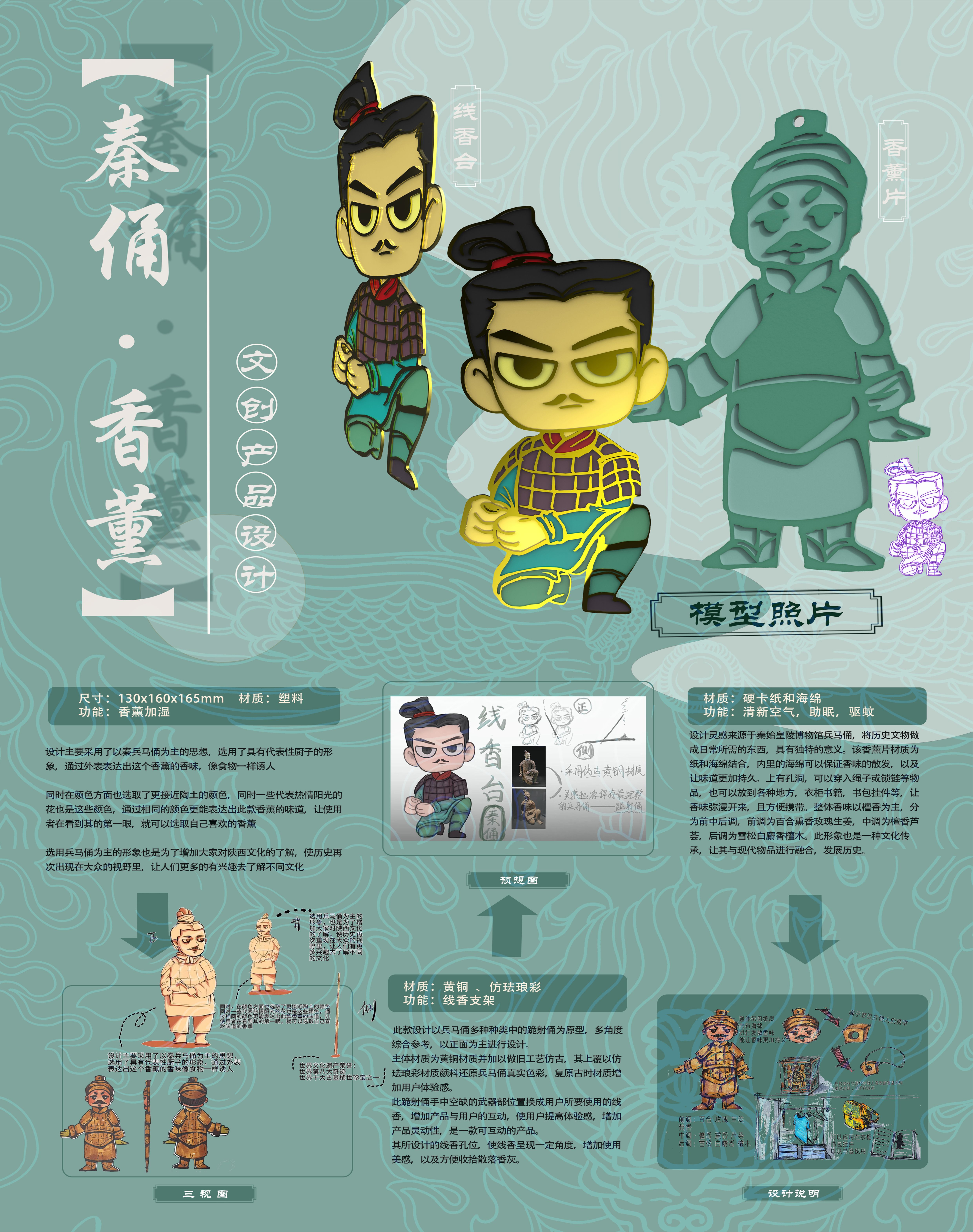 此款设计以兵马俑种类中的跪射俑为原型,多角度综合参考,以正面为主进行设计。主体材质为黄铜材质并加以做旧工艺仿古,其上覆以仿珐琅彩材质颜料还原兵马俑真实色彩,复原古时材质增加用户体验感。此跪射俑手中空缺的武器部位置换成用户所要使用的线香,增加产品与用户的互动,使用户提高体验感,增加产品灵动性,是一款可互动的产品。其所设计的线香孔位,使线香呈现一定角度,增加使用美感,以及方便收拾散落香灰。
