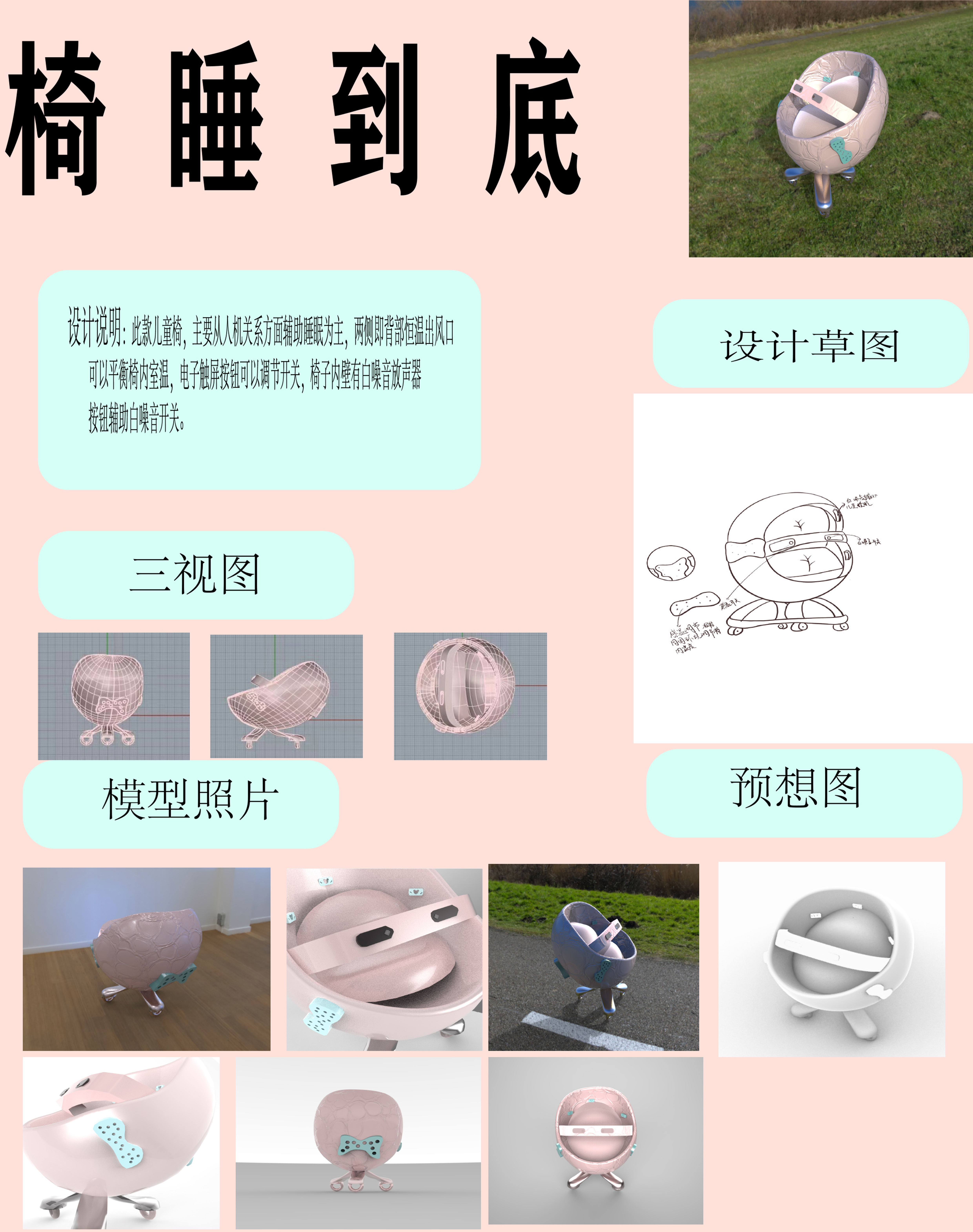 设计说明:此款儿童椅,主要从人机关系方面辅助睡眠为主,两侧即背部恒温出风口 可以平衡椅内室温,电子触屏按钮可以调节开关,椅子内壁有白噪音放声器 按钮辅助白噪音开关。