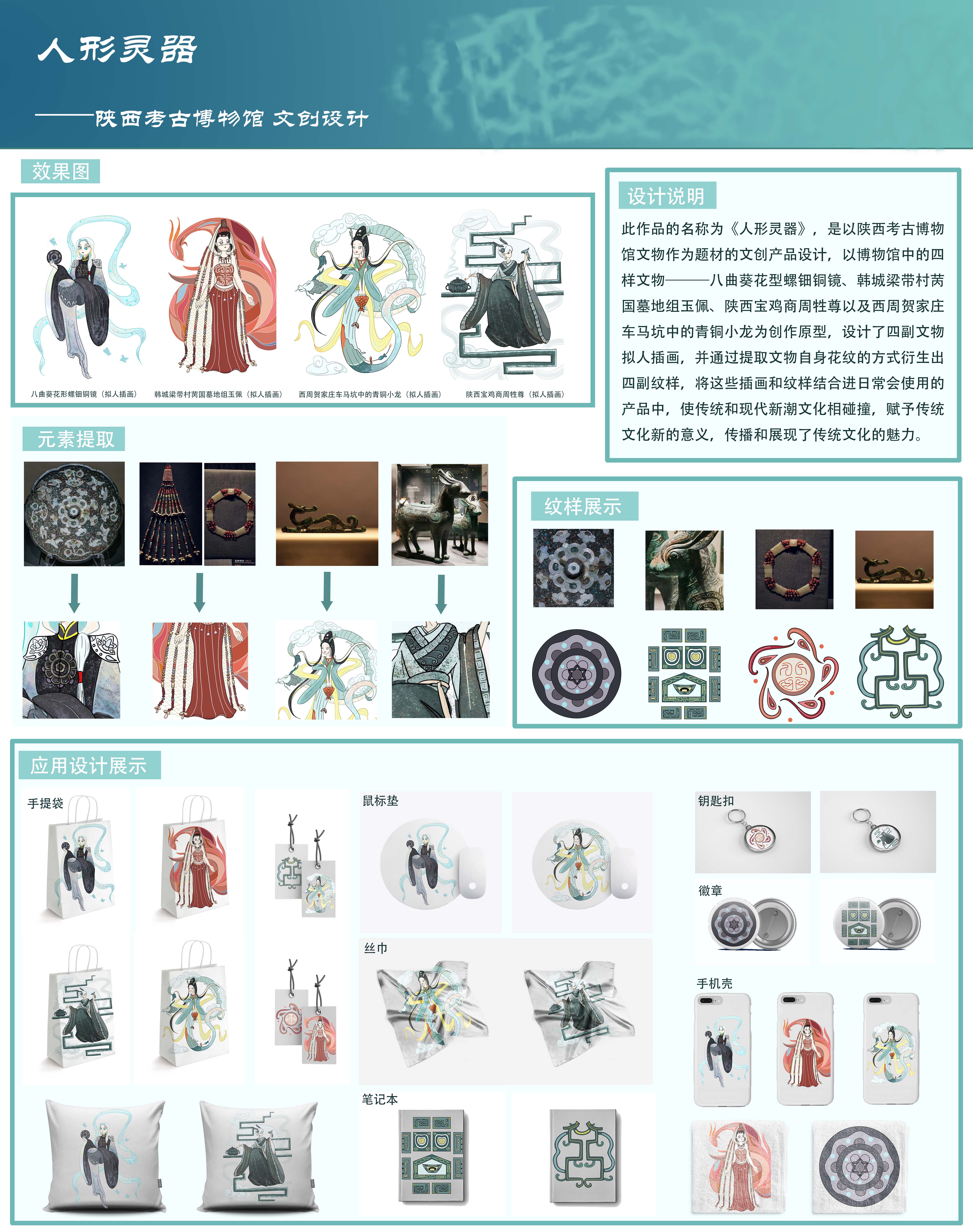 此作品的名称为《人形灵器》,是以陕西考古博物馆文物作为题材的文创产品设计,以博物馆中的四样文物———八曲葵花型螺钿铜镜、韩城梁带村苪国墓地组玉佩、陕西宝鸡商周牲尊以及西周贺家庄车马坑中的青铜小龙为创作原型,设计了四副文物拟人插画,并通过提取文物自身花纹的方式衍生出四副纹样,将这些插画和纹样结合进日常会使用的产品中,使传统和现代新潮文化相碰撞,赋予传统文化新的意义,传播和展现了传统文化的魅力。