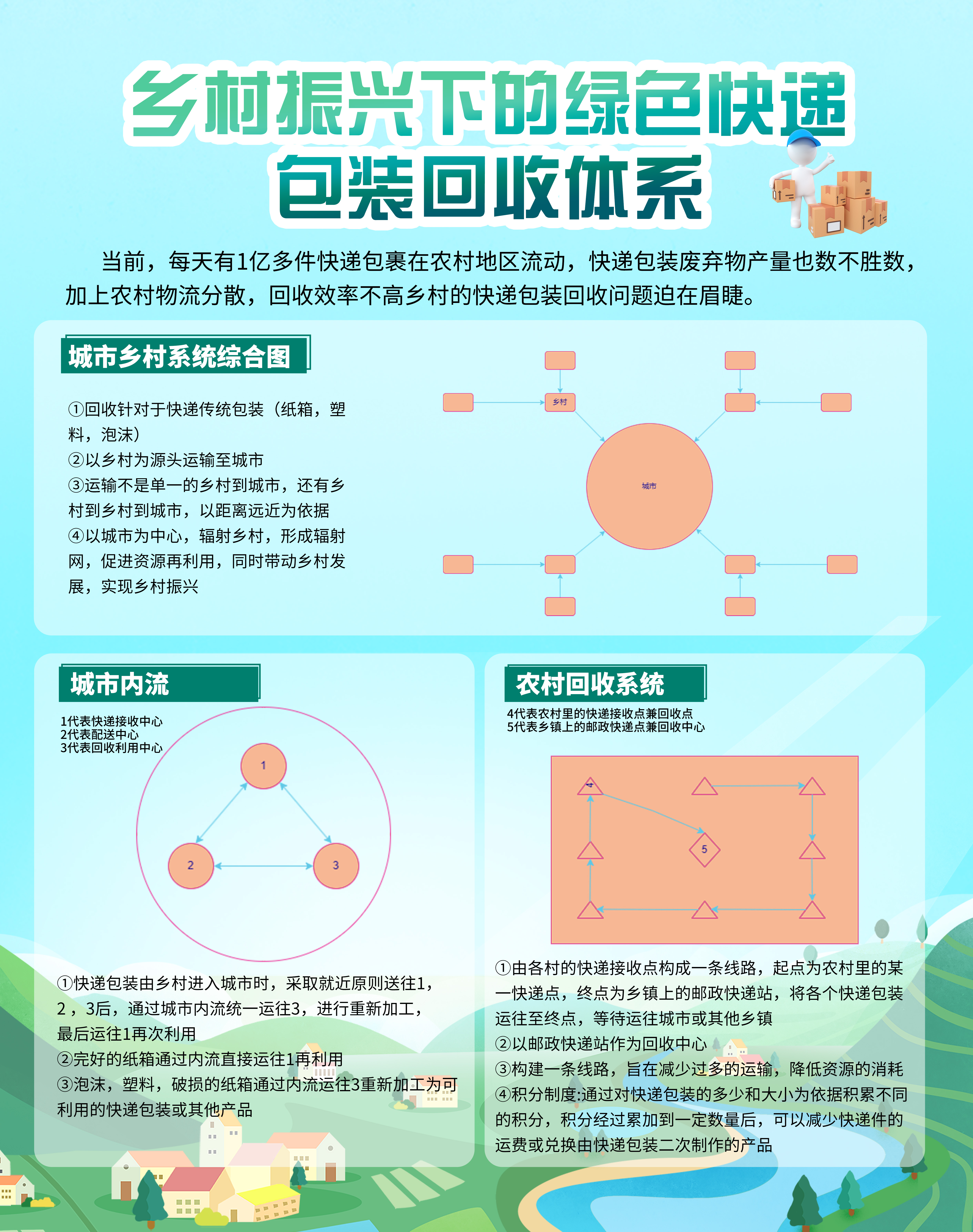 名 称:乡村振兴下的绿色快递包装回收体系 回收对象:快递邮件的包装(纸箱,塑料,泡沫) 回收地点:农村 本产品针对于资源回收不便利的农村,职能为资源回收减少资源浪费,运输及其再加工利用。产品规划中起点为农村重点为农村,连接农村与城市形成运输网络,通过运输网络运送快递回收件,同时形成以城市为中心的辐射网,辐射带动农村发展。