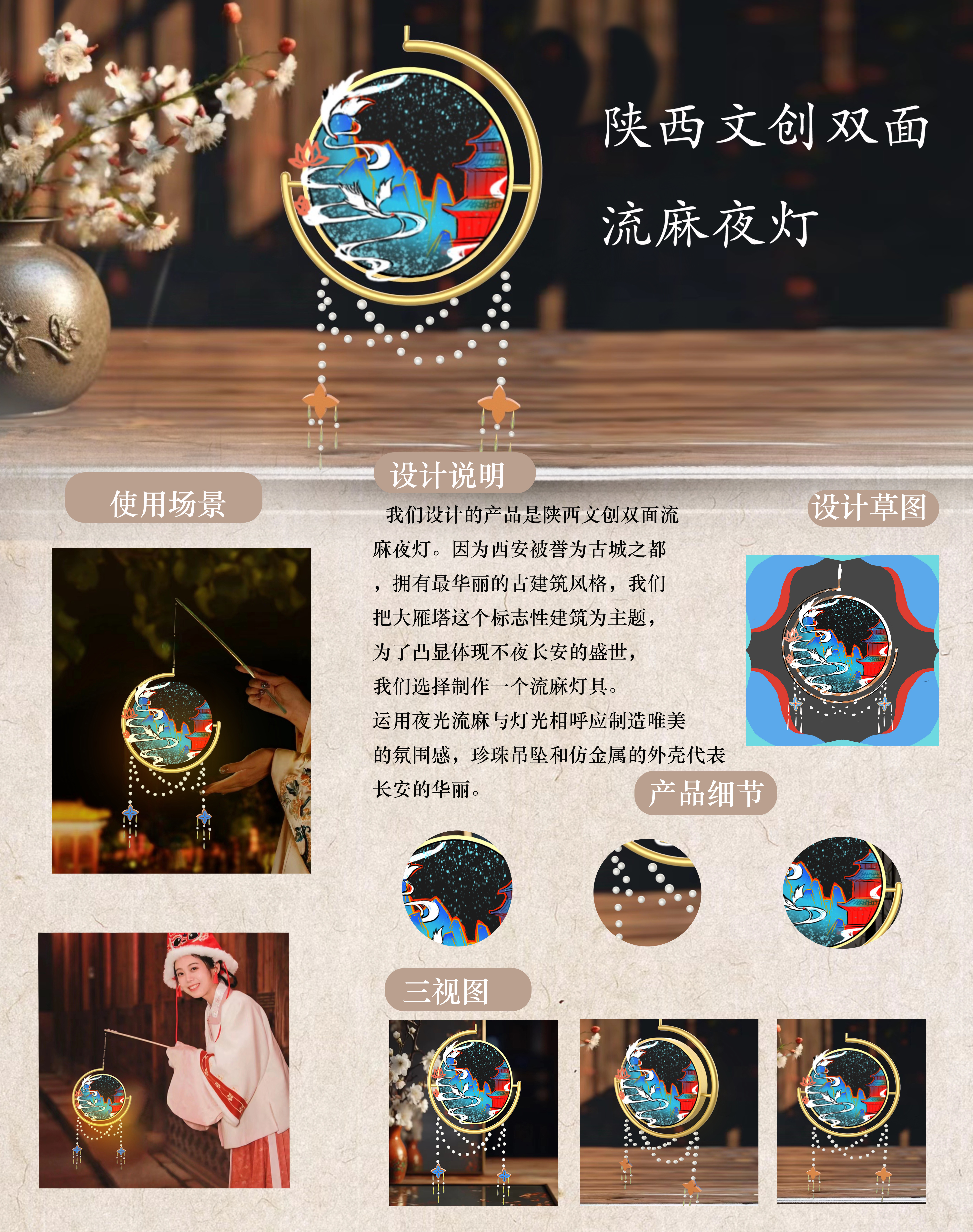 我们设计的产品是陕西文创双面流麻夜灯。因为西安被誉为古城之都,拥有最华丽的古建筑风格,我们把大雁塔这个标志性建筑为主题,为了凸显体现不夜长安的盛世,我们选择制作一个流麻灯具。运用夜光流麻与灯光相呼应制造唯美的氛围感,珍珠吊坠和仿金属的外壳代表长安的华丽,图案运用半透明的形式呈现出光影感。