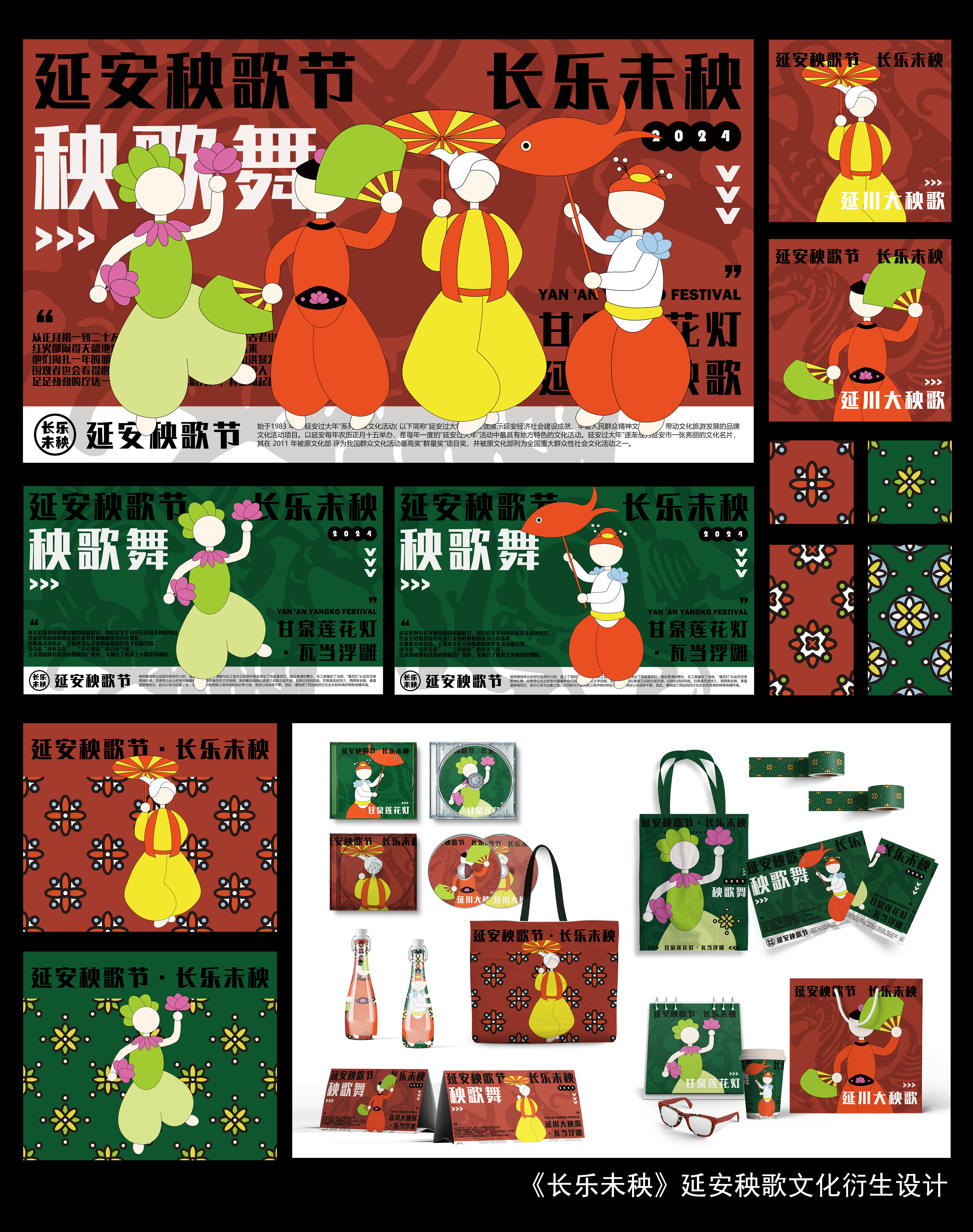 作品意在打造延安秧歌节城市品牌文创设计,宣传陕北民俗文化中秧歌舞蹈习俗,以具有鲜明的地域特色与文化内涵的延川大秧歌与甘泉莲花舞两大秧歌舞蹈动态与舞蹈装扮作为设计素材,采用抽象扁平化设计人物形象并从中选取服装花纹几何化处理作为辅助样式,以出自汉代文物汉长乐未央瓦当与秧歌的谐音长乐未“秧”来命名,象征秧歌节中的长久欢乐永不结束,以及延安各地对幸福生活、美好未来的殷切期盼。