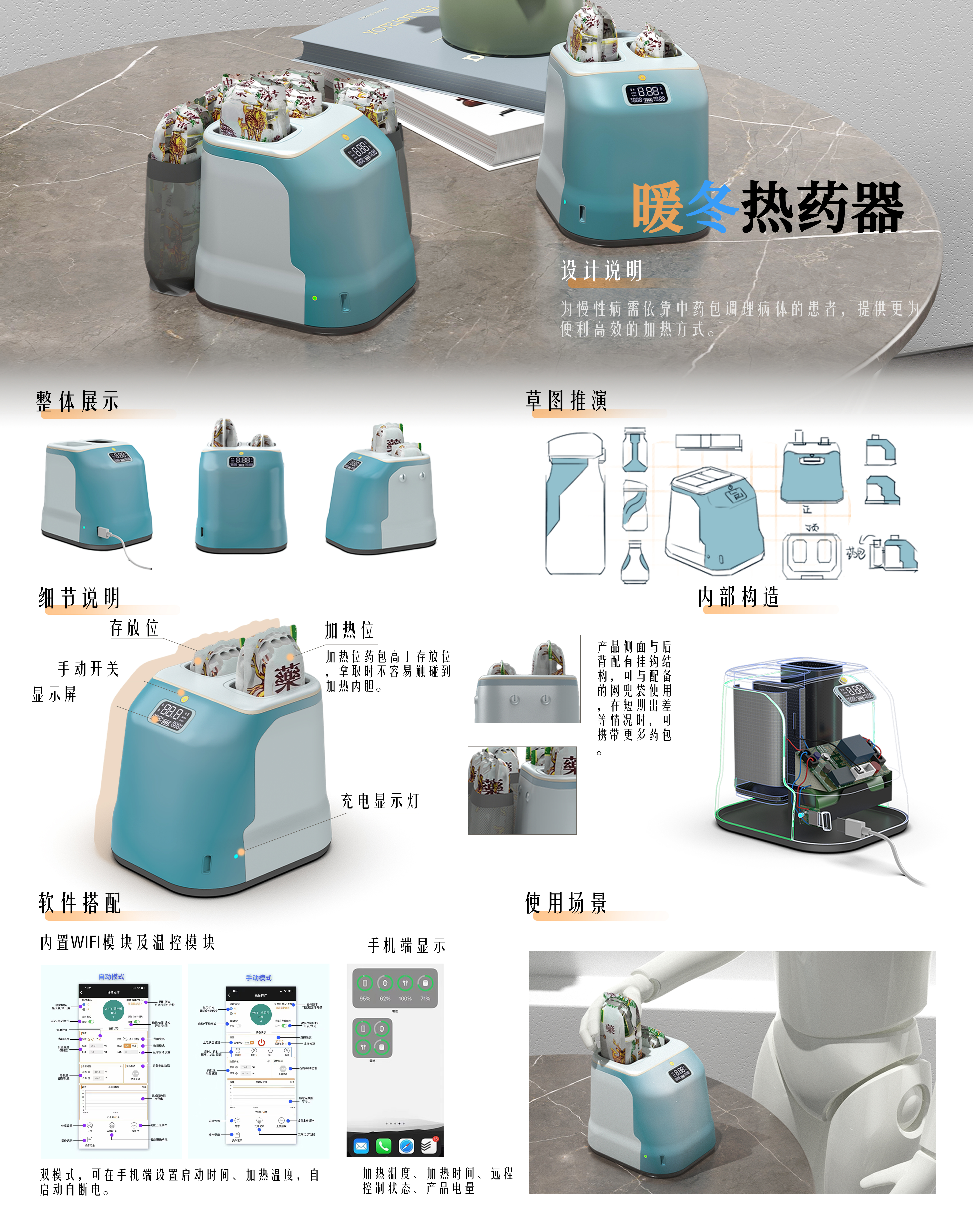 为慢性病需要饮用中药包调养人群设计的便捷高效加热器,解决外出加热难、加热流程多等问题。此设计根据该痛点,整体外观以马蹄及面包机为灵感,诙谐有趣;配色采用蓝白渐变为主色,让患者可以减少一些对医疗产品及中药的恐惧;且便捷无需加热介质可充电式高效加热器,为饮用中药包的人群提供更便利的加热方式。