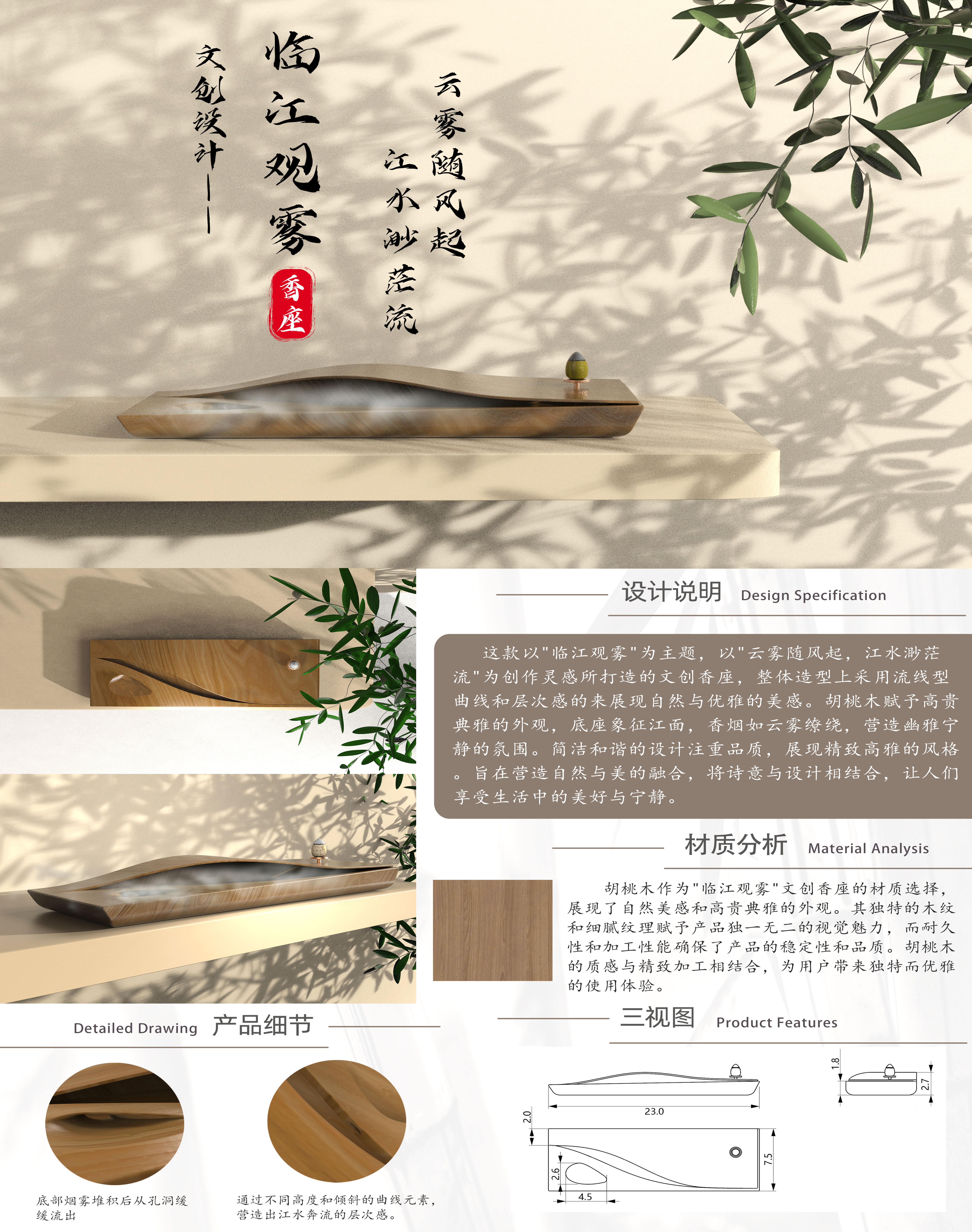 这款以“临江观雾”为主题,以“云雾随风起,江水渺茫流”为创作灵感所打造的文创香座,整体造型上采用流线型曲线和层次感来展现自然与优雅的美感。胡桃木赋予高贵典雅的外观,底座象征江面,点然的烟如云雾缭绕,营造优雅宁静的氛围。简洁和谐的设计注重品质,展现精致高雅的风格。旨在营造自然与美的融合,将诗意与设计相结合,让人们享受生活中的美好与宁静。