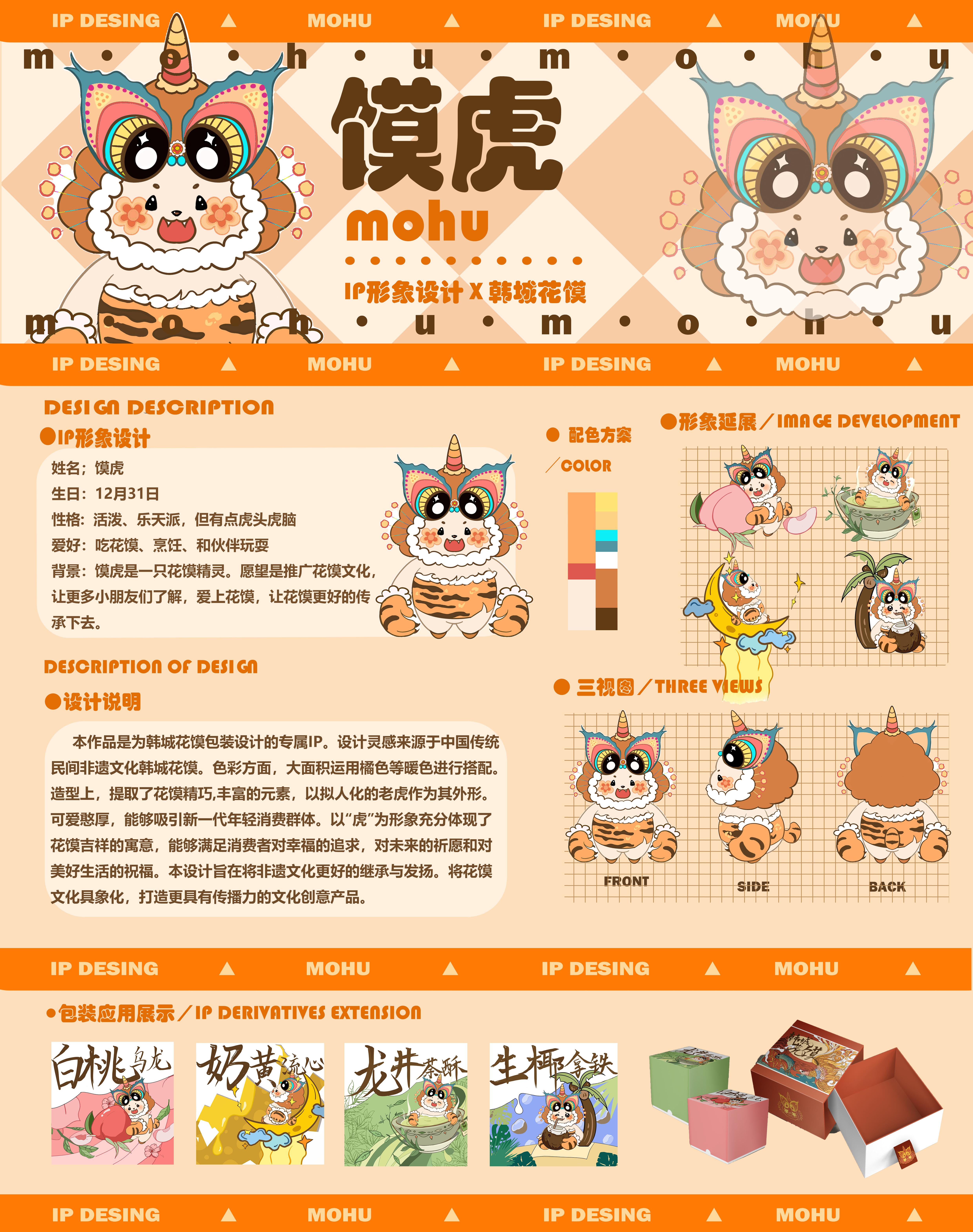 本作品是为韩城花馍包装设计的专属IP。设计灵感来源于中国传统民间非遗文化韩城花馍。色彩方面,大面积运用橘色等暖色进行搭配。造型上,提取了花馍精巧丰富的元素,以拟人化的老虎作为其外形。可爱憨厚,能够吸引新一代年轻消费群体。以“虎”为形象充分体现了花馍吉祥的寓意,能够满足消费者对对未来的祈愿和对美好生活的祝福。本设计旨在将非遗文化更好的继承与发扬。将花馍文化具象化,打造更具有传播力的文化创意产品。