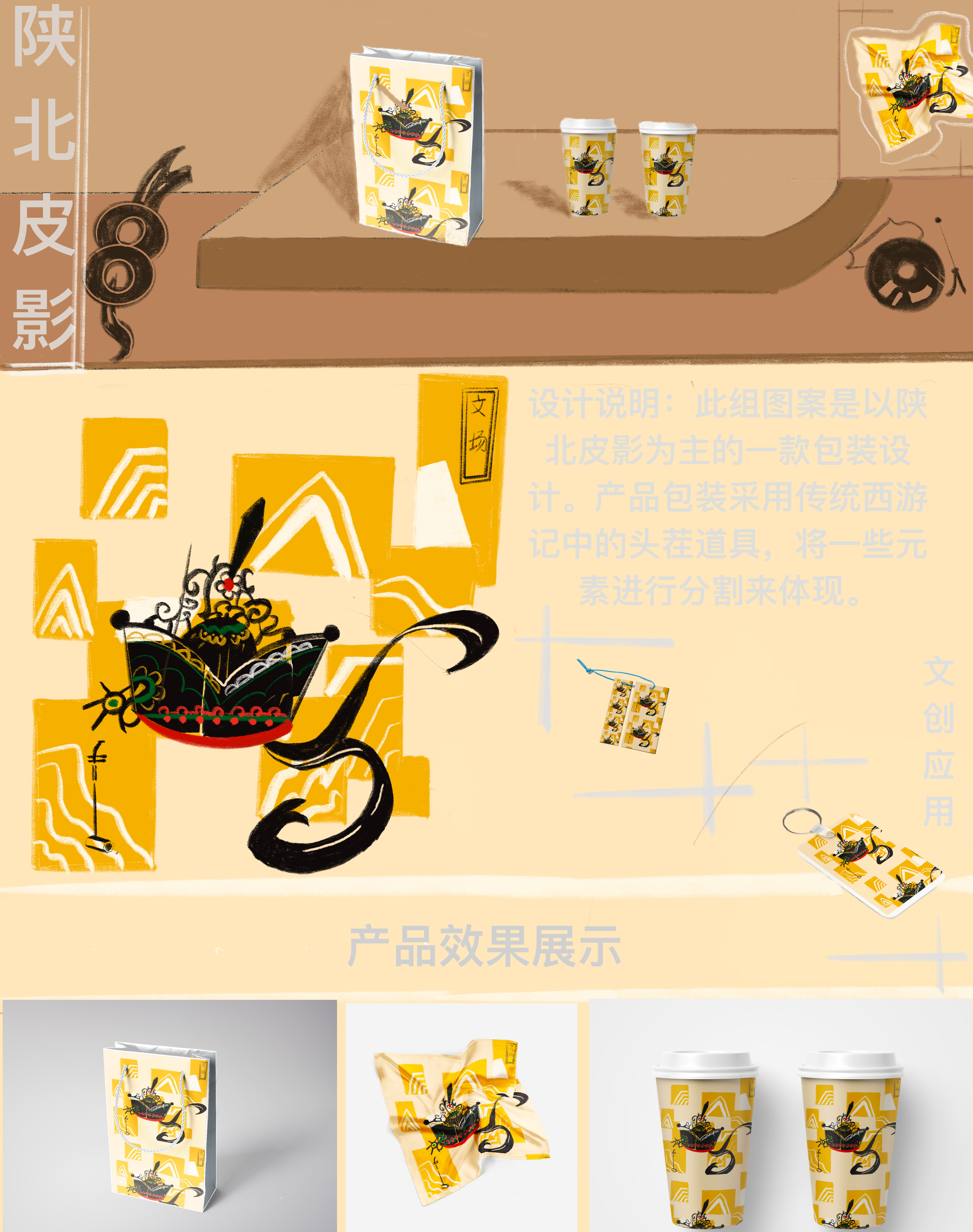此组图案是以陕北皮影为主的一款包装设计。产品包装采用传统西游记中的头饰道具,将一些元素黑白化设计,由黄色插入一些山形来衬托皮影,以来传承非文化遗产。