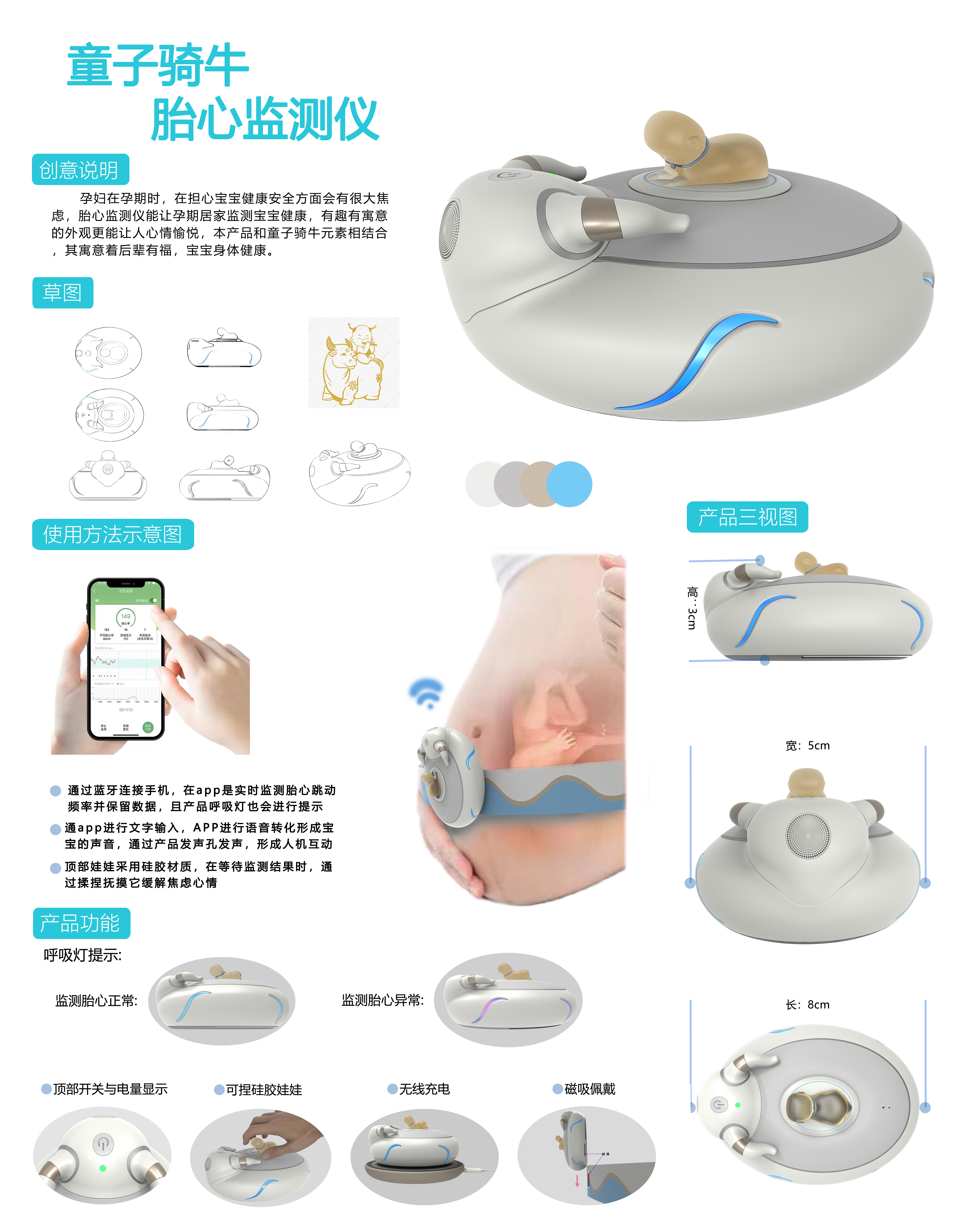 为了缓解孕妇在孕期时对胎儿的焦虑情况,胎心监测仪就可以居家监测宝宝的情况,本设计是将外观与‘童子骑牛’造型相结合(童子骑牛寓意后辈有福,含义象征好,可以予人精神安慰),且外观可爱圆润,材质采用软质硅胶及磨砂材料,可在等待监测结果时抚摸产品,舒缓焦虑;且产品可以让爸爸通过手机端输入文字,产品可以转化成宝宝的声音,通过这样的方式互动,让妈妈可以开心;让孕妇身边人更重视孕妇的心理健康。