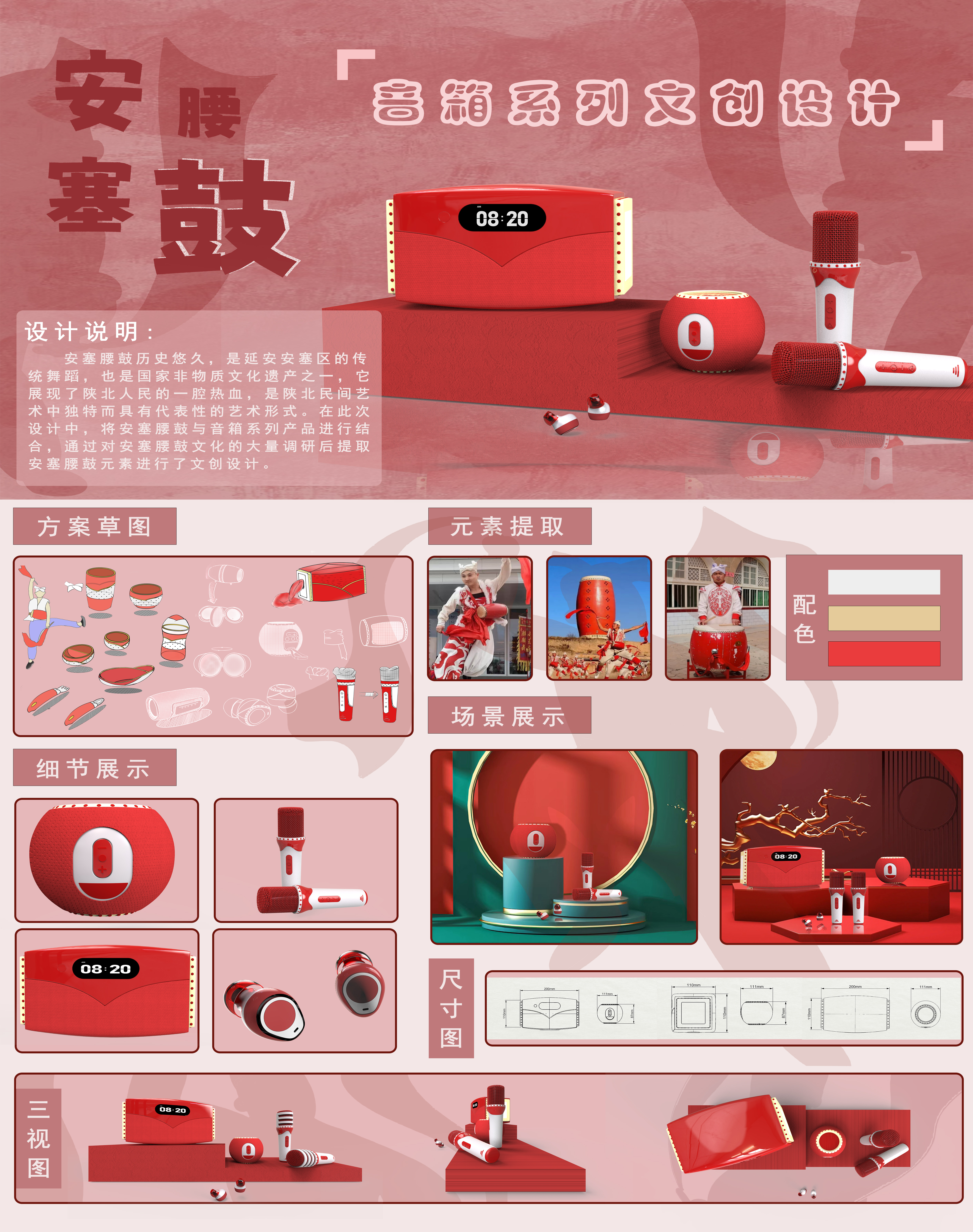 安塞腰鼓作为我国第一批国家级非物质文化遗产,是陕北民间艺术中独特而具代表性的艺术形式。其自身具有丰富的文化内涵,它是一种民间的舞蹈,更是一种深刻的文化现象,有浓厚的当地人民生活的气息。是陕北民间艺术中独特的而具有代表性的艺术形式。在此次设计中,根据安塞腰鼓的外观功能等特点,将其与音箱、耳机、话筒结合进行了系列设计创作,赋予产品文化内涵的同时也发扬了中国传统文化。