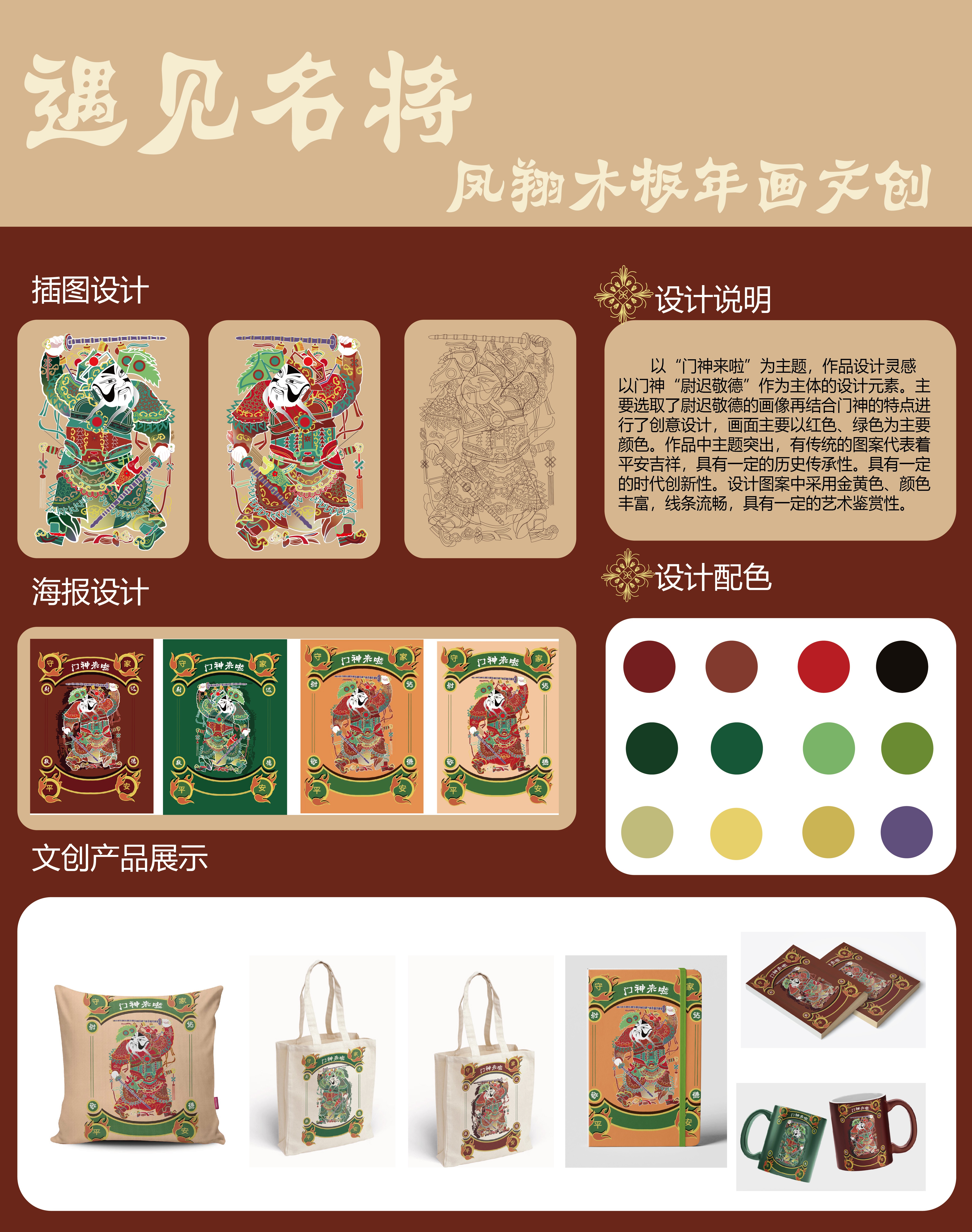 以“遇见名将-门神来啦”为主题,作品设计灵感以门神“尉迟敬德”作为主体的设计元素。主要选取了尉迟敬德的画像再结合门神的特点进行了创意设计,画面主要以红色、绿色为主要颜色。作品中主题突出,有传统的图案代表着平安吉祥,具有一定的历史传承性和时代创新性。设计图案中采用金黄色、颜色丰富,线条流畅,具有一定的艺术鉴赏性。