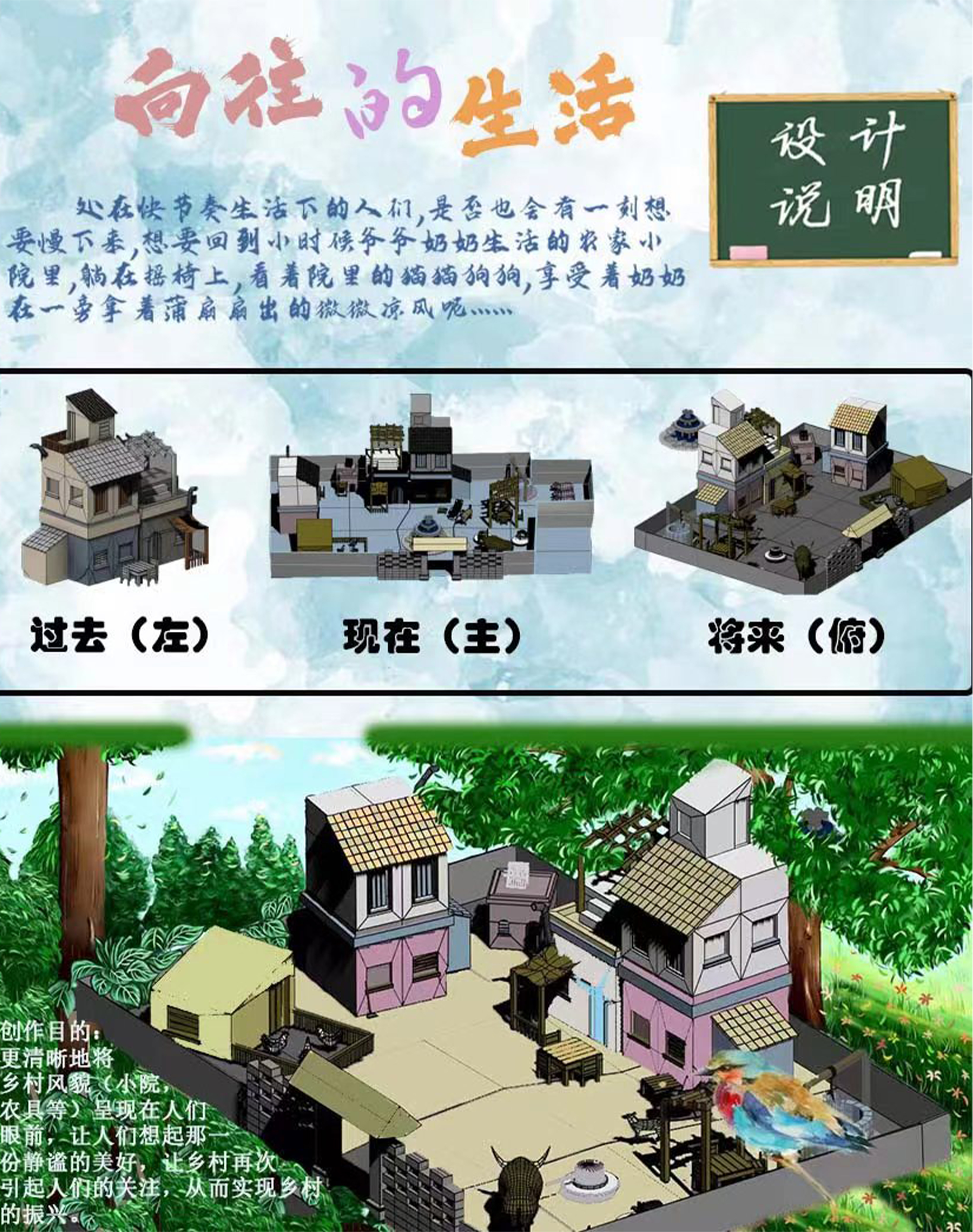 随着社会的发展,科技的进步,时代的变迁,人们不得不随着时间的流逝而加快生活节奏。处在快节奏生活下的人们,居住在钢筋水泥当中,是否也会有一刻想要慢下来,想要回到小时候爷爷奶奶生活的农家小院里,躺在摇椅上,看着院里的猫猫狗狗,享受着奶奶在一旁拿着蒲扇扇出的微微凉风呢……更清晰的将乡村风貌(小院、农具等)呈现在人们眼前,让人们想起那一份静谧的美好,让乡村再次引起人们的关注,从而实现乡村的振兴。