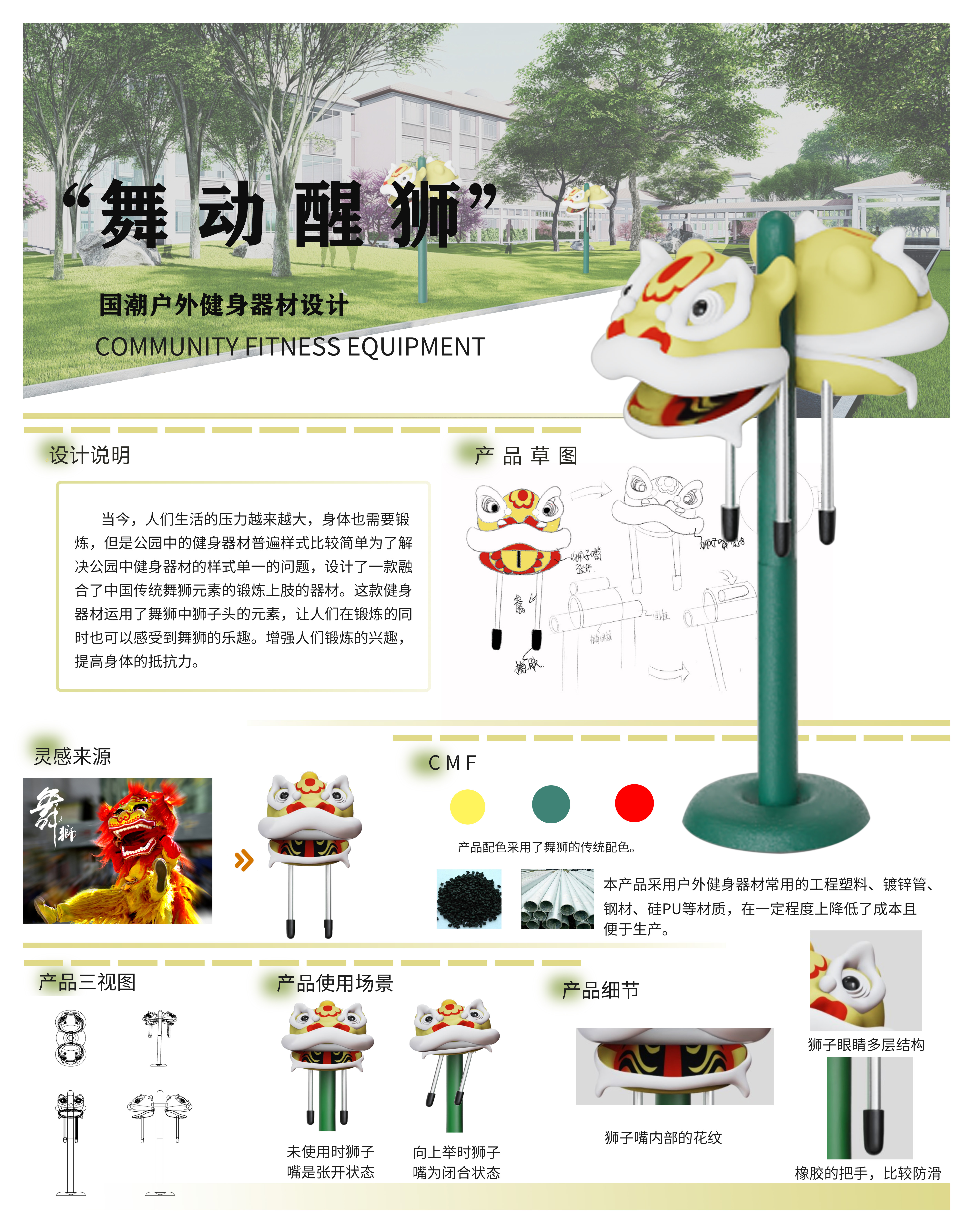本设计是以醒狮为灵感设计的一款户外健身器材,让人们在健身的同时也可以感受到传统文化的魅力