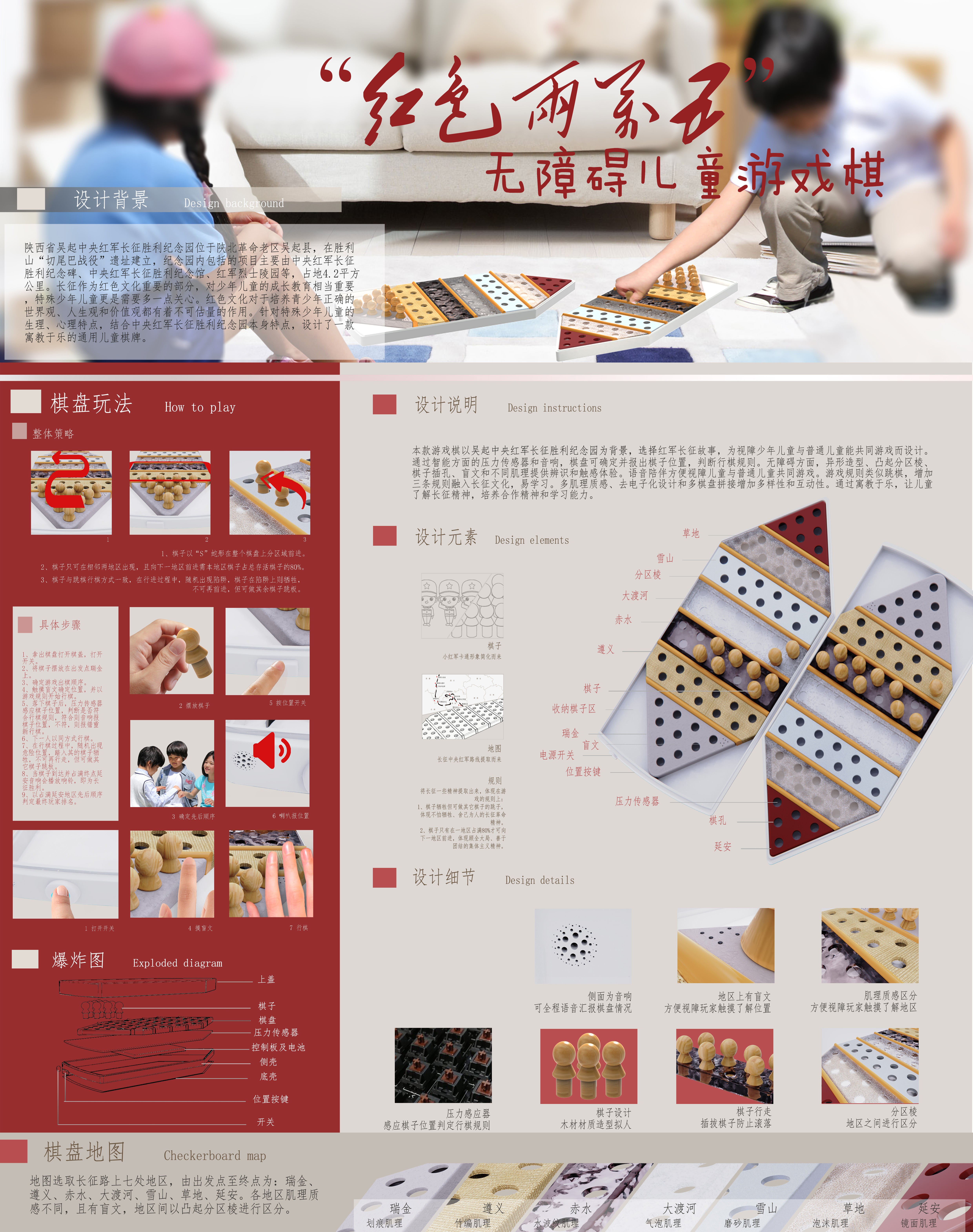 本款游戏棋是为吴起中央红军长征胜利纪念园设计红色儿童游戏棋,选择红军长征故事。视障少年儿童可与普通儿童共同游戏。通过智能方面的压力传感器和音响,棋盘可确定并报出棋子位置,判断规则。无障碍方面:异形造型、分区棱、棋子插孔、盲文和不同肌理提供辨识和触感体验。游戏规则同跳棋并融入长征文化。多肌理质感、去电子化设计和多棋盘拼接增加互动性。通过寓教于乐,让儿童了解长征精神,培养合作精神和学习能力。