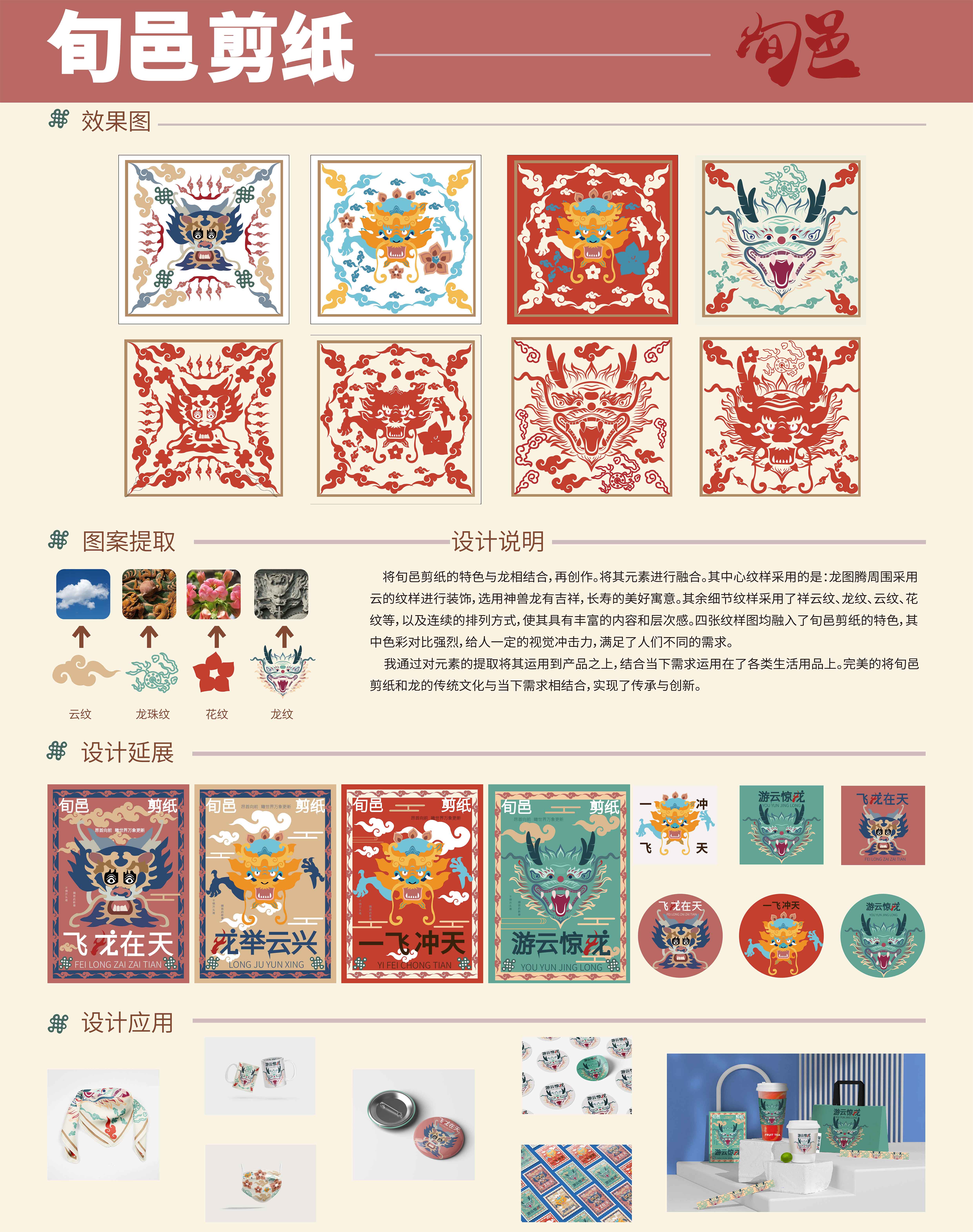 将旬邑剪纸的特色与龙相结合,再创作。将其元素进行融合。其中心纹样采用的是:龙图腾周围采用云的纹样进行装饰,选用神兽龙有吉祥,长寿的美好寓意。其余细节纹样采用了祥云纹、龙纹、云纹、花纹等,以及连续的排列方式,使其具有丰富的内容和层次感。四张纹样图均融入了旬邑剪纸的特色,其中色彩对比强烈,给人一定的视觉冲击力,满足了人们不同的需求。