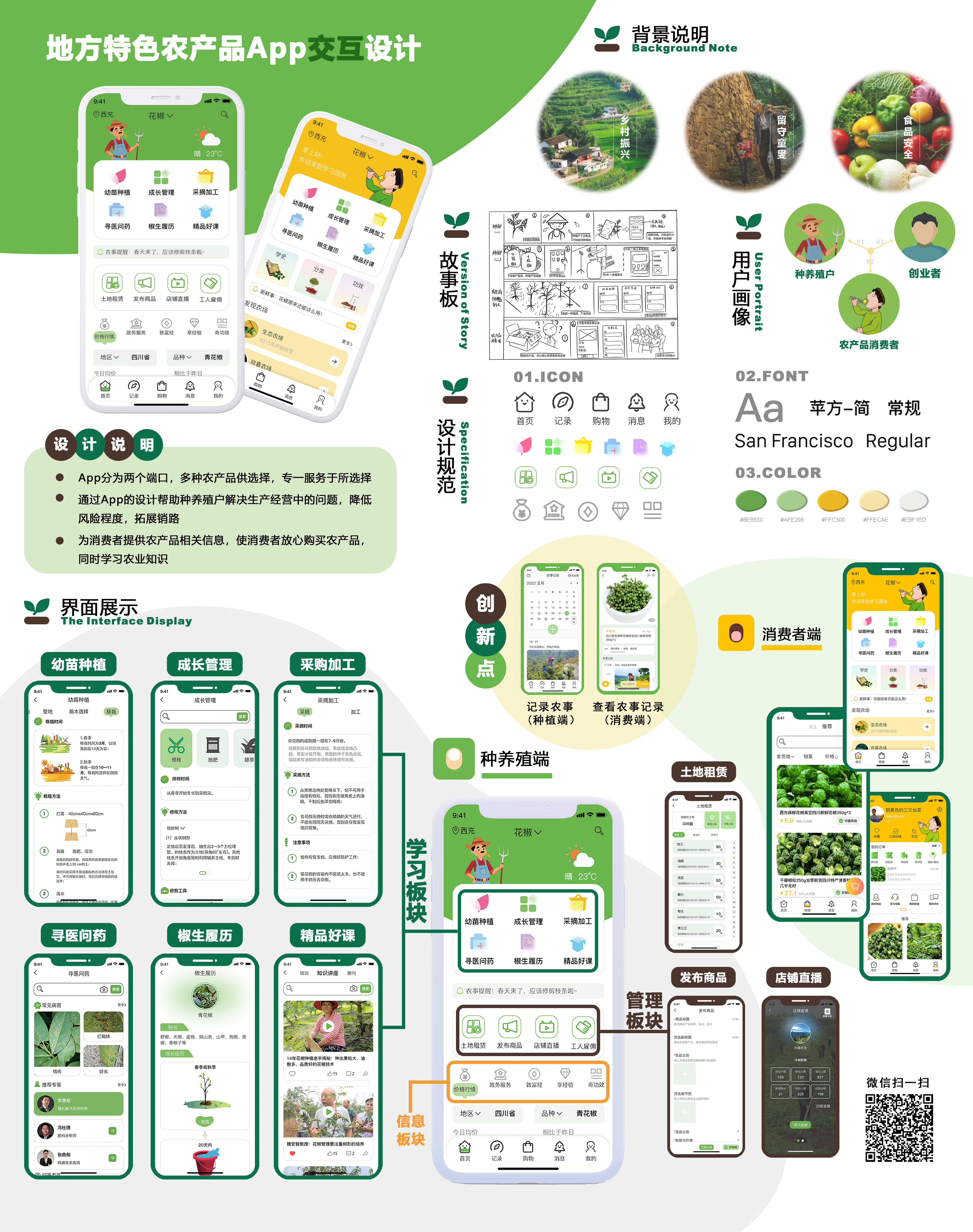 为解决种养殖户有关种养殖、销售方面的问题,通过互联网资源使种养殖户实现成本最小、利润最大化,拉动地方经济增长。同时,为解决农村农业存在的劳动力断代问题,广泛传播农业知识与技术,对青年创业者带来帮助,也为消除消费者购买农产品时的疑虑,增加食品安全保障,将展开对地方特色农产品 APP 交互设计。以“互联网+农业”为渠道,发展精细农业、高效农业、绿色农业,实现乡村经济振兴,引进年轻力量。