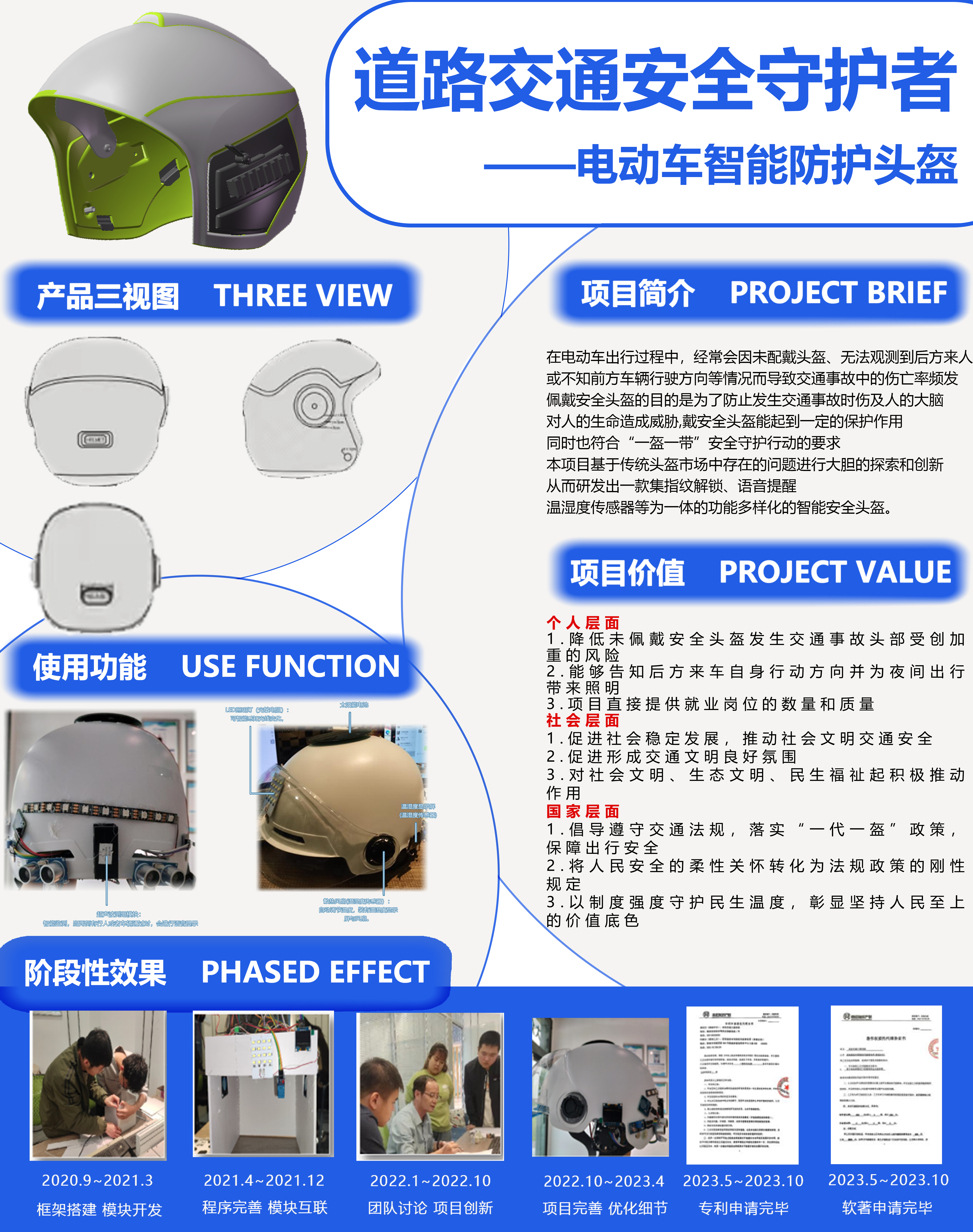 响应“一盔一带”安全守护行动的要求。因此在选择电动车出行时佩戴安全头盔是十分有必要的。针对目前行业内还没有出现一种安全、可靠、制造成本低且功能齐全的智能头盔来解决电动车出行问题。本项目基于传统头盔市场中存在的问题进行大胆的探索和创新,从而研发出一款集指纹解锁、语音提醒、温湿度传感器等于一体的功能多样化的智能安全头盔。