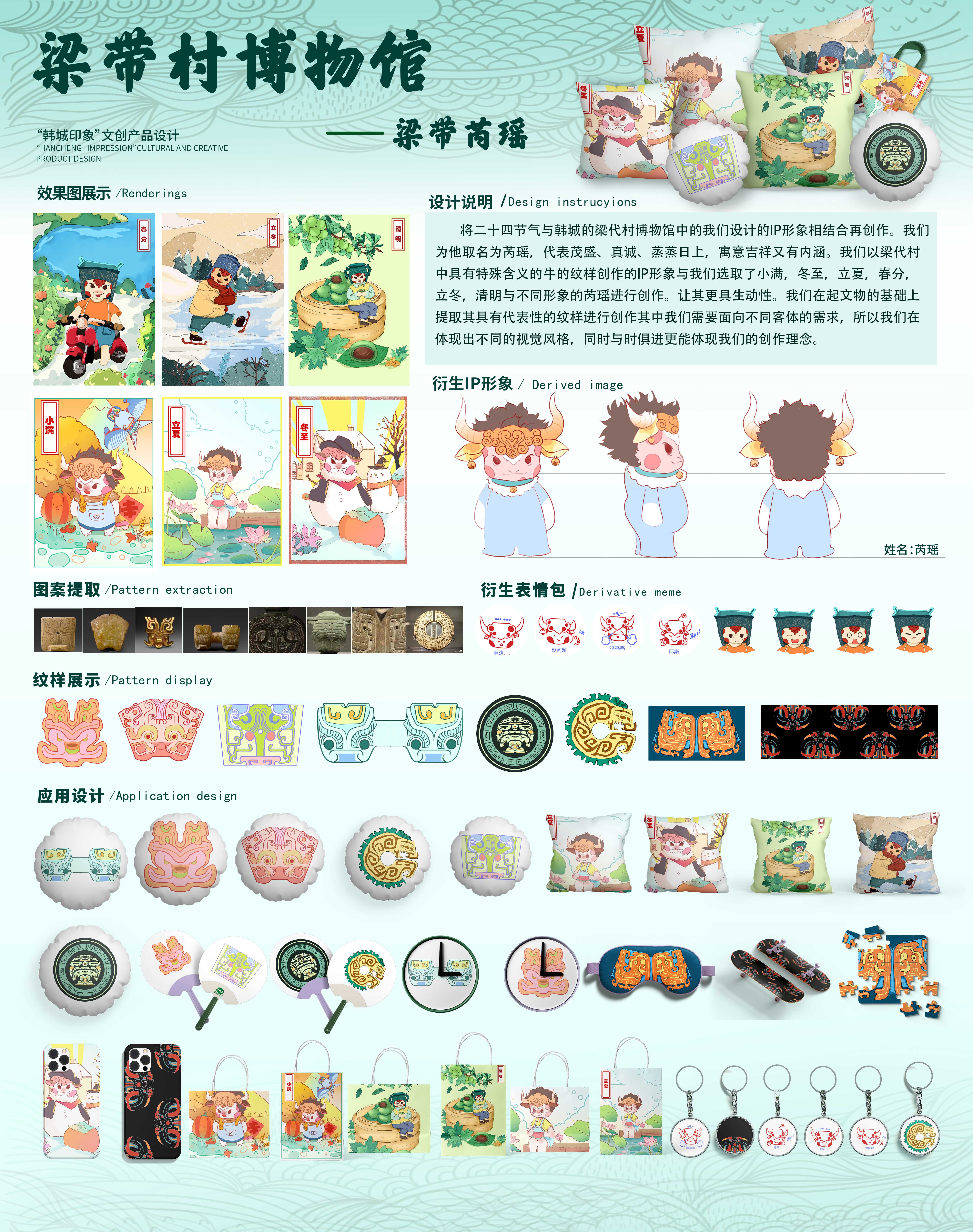 将二十四节气与韩城的梁代村博物馆中的我们设计的IP形象相结合,再创作。我们为他取名为芮瑶,其含义为“芮”代表着茂盛、真诚、蒸蒸日上,寓意吉祥又有内涵。我们选取了小满,冬至,立夏,春分,立冬,清明与不同形象的芮瑶进行创作。让其更具生动性。我们在起文物的基础上提取其具有代表性的纹样进行创作,其中我们需要面向不同客体的需求,所以我们在体现出不同的视觉风格展现出传统文化与当下需求的相结合,实现传承与创新。