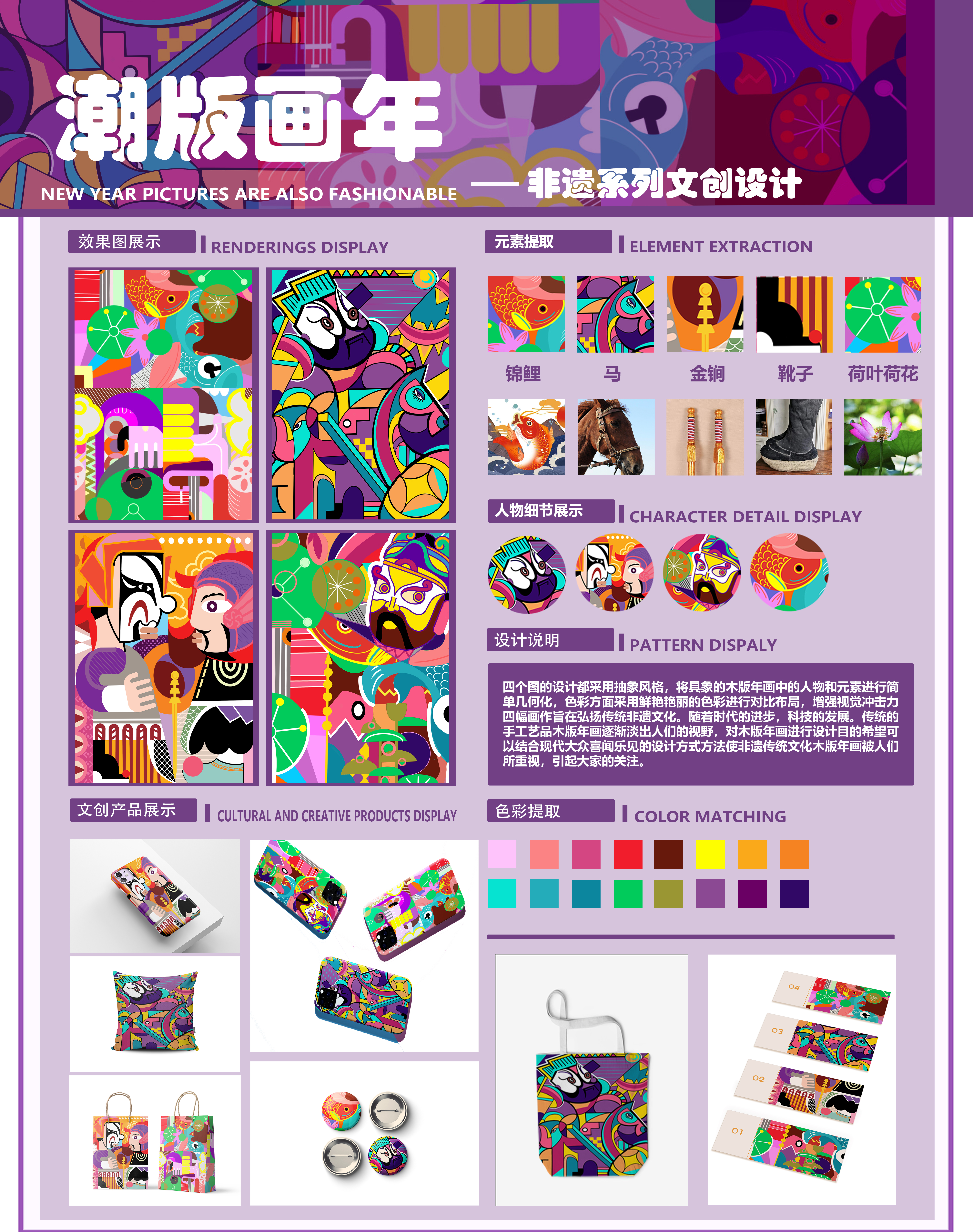 四幅图的设计都采用抽象风格,将具象的木版年画中的人物和元素进行简单几何化,色彩方面采用鲜艳艳丽的色彩进行对比布局,增强视觉冲击力四幅画作旨在弘扬传统非遗文化。随着时代的进步,科技的发展。传统的手工艺品木版年画逐渐淡出人们的视野,对木版年画进行设计目的希望可以结合现代大众喜闻乐见的设计方式方法使非遗传统文化木版年画被人们所重视,引起大家的关注。